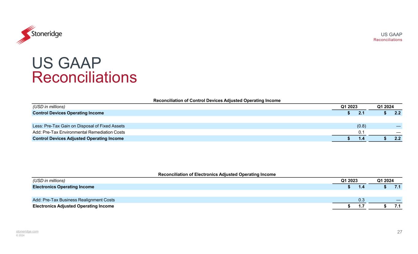 stoneridge.com © 2024 US GAAP Reconciliations 26 US GAAP Reconciliations Reconciliation of Adjusted EBITDA Q1 2024Q4 2023Q3 2023Q2 2023Q1 2023(USD in millions) $ (5.6)$ 3.2$ 4.4$ (1.5)$ (8.1)Income (Loss) Before Tax 3.63.83.33.12.7Interest expense, net 8.68.48.58.48.3Depreciation and amortization $ 6.6$ 15.5$ 16.2$ 10.0$ 3.0EBITDA —0.11.21.91.3Add: Pre-Tax Business Realignment Costs ————(0.8)Less: Pre-Tax Gain on Disposal of Fixed Assets ————0.1Add: Pre-Tax Environmental Remediation Costs ——(0.5)——Add: Pre-Tax Brazilian Indirect Tax Credits, Net $ 6.6$ 15.6$ 17.0$ 11.9$ 3.6Adjusted EBITDA