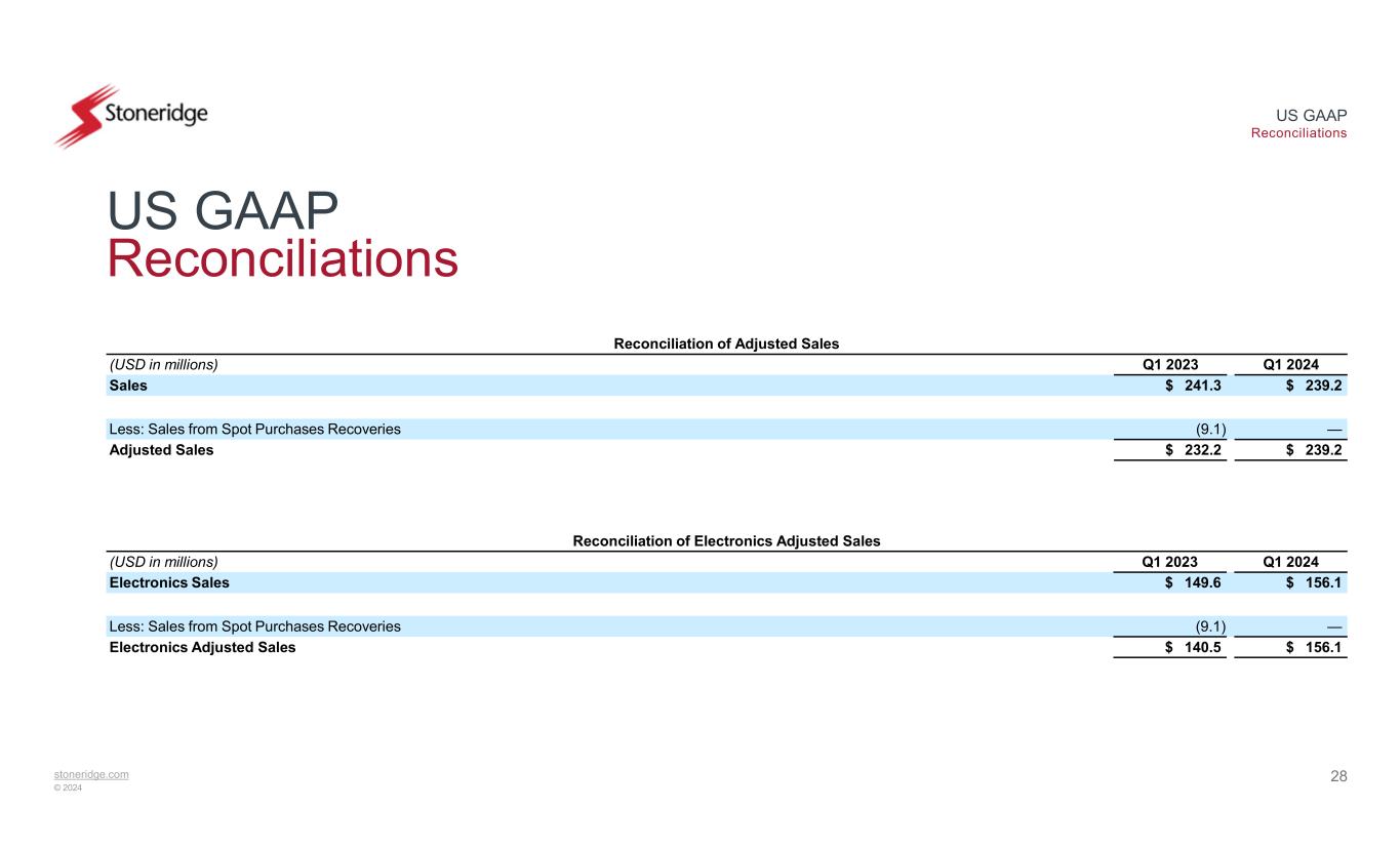 stoneridge.com © 2024 US GAAP Reconciliations 27 US GAAP Reconciliations Reconciliation of Control Devices Adjusted Operating Income Q1 2024Q1 2023(USD in millions) $ 2.2$ 2.1Control Devices Operating Income —(0.8)Less: Pre-Tax Gain on Disposal of Fixed Assets —0.1Add: Pre-Tax Environmental Remediation Costs $ 2.2$ 1.4Control Devices Adjusted Operating Income Reconciliation of Electronics Adjusted Operating Income Q1 2024Q1 2023(USD in millions) $ 7.1$ 1.4Electronics Operating Income —0.3Add: Pre-Tax Business Realignment Costs $ 7.1$ 1.7Electronics Adjusted Operating Income