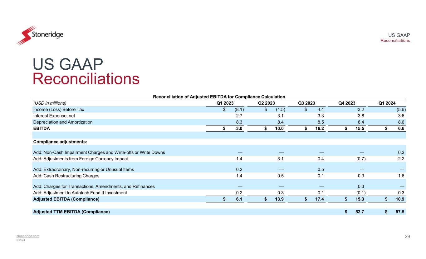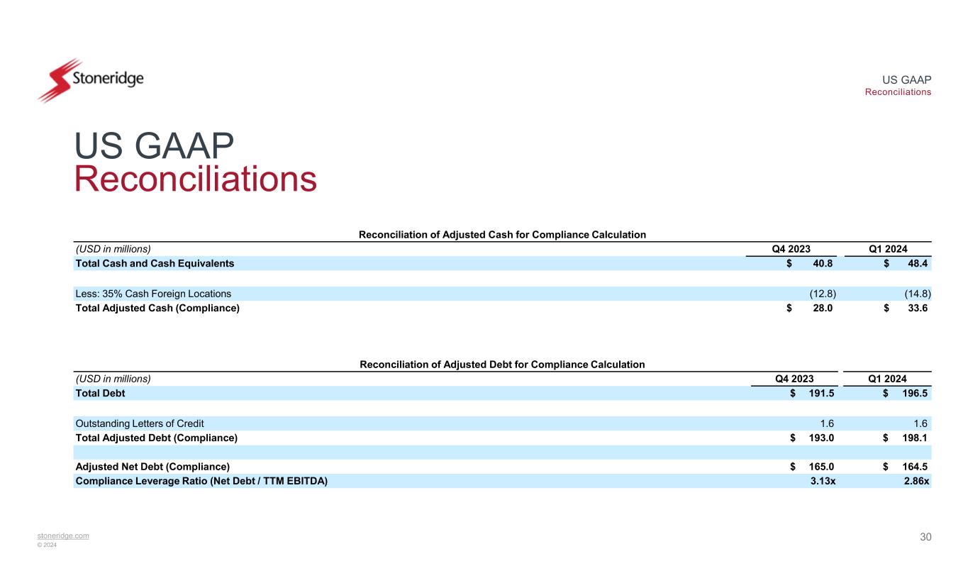 stoneridge.com © 2024 US GAAP Reconciliations 29 US GAAP Reconciliations Reconciliation of Adjusted EBITDA for Compliance Calculation Q1 2024Q4 2023Q3 2023Q2 2023Q1 2023(USD in millions) (5.6)3.2$ 4.4$ (1.5)$ (8.1)Income (Loss) Before Tax 3.63.83.33.12.7Interest Expense, net 8.68.48.58.48.3Depreciation and Amortization $ 6.6$ 15.5$ 16.2$ 10.0$ 3.0EBITDA Compliance adjustments: 0.2————Add: Non-Cash Impairment Charges and Write-offs or Write Downs 2.2(0.7)0.43.11.4Add: Adjustments from Foreign Currency Impact ——0.5—0.2Add: Extraordinary, Non-recurring or Unusual Items 1.60.30.10.51.4Add: Cash Restructuring Charges —0.3———Add: Charges for Transactions, Amendments, and Refinances 0.3(0.1)0.10.30.2Add: Adjustment to Autotech Fund II Investment $ 10.9$ 15.3$ 17.4$ 13.9$ 6.1Adjusted EBITDA (Compliance) $ 57.5$ 52.7Adjusted TTM EBITDA (Compliance)