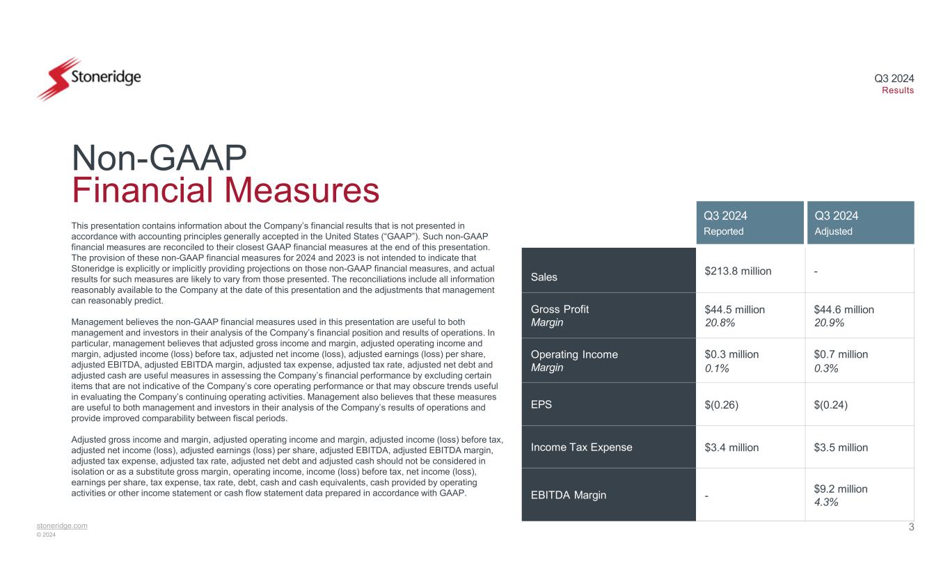 stoneridge.com © 2024 Q3 2024 Results 2 Forward-Looking Statements Statements in this presentation that are not historical facts are forward-looking statements, which involve risks and uncertainties that could cause actual events or results to differ materially from those expressed or implied by the statements. Important factors that may cause actual results to differ materially from those in the forward-looking statements include, among other factors, the ability of our suppliers to supply us parts and components at competitive prices on a timely basis, including the impact of potential tariffs and trade considerations on their operations and output; fluctuations in the cost and availability of key materials (including semiconductors, printed circuit boards, resin, aluminum, steel and copper) and components and our ability to offset cost increases through negotiated price increases with our customers or other cost actions, as necessary; global economic trends, competition and geopolitical risks, including impacts from ongoing or potential conflicts and any related sanctions and other measures, or an escalation of sanctions, tariffs or other trade tensions between the U.S. and other countries; our ability to achieve cost reductions that offset or exceed customer-mandated selling price reductions; the reduced purchases, loss or bankruptcy of a major customer or supplier; the costs and timing of business realignment, facility closures or similar actions; a significant change in automotive, commercial, off-highway or agricultural vehicle production; competitive market conditions and resulting effects on sales and pricing; foreign currency fluctuations and our ability to manage those impacts; customer acceptance of new products; our ability to successfully launch/produce products for awarded business; adverse changes in laws, government regulations or market conditions, affecting our products, our suppliers, or our customers’ products; labor disruptions at Stoneridge’s facilities or at any of Stoneridge significant customers or suppliers; the amount of Stoneridge’s indebtedness and the restrictive covenants contained in the agreements governing its indebtedness, including its revolving Credit Facility; capital availability or costs, including changes in interest rates; the occurrence or non-occurrence of circumstances beyond Stoneridge’s control; and the items described in “Risk Factors” and other uncertainties or risks discussed in Stoneridge’s periodic and current reports filed with the Securities and Exchange Commission. Important factors that could cause the performance of the commercial vehicle and automotive industry to differ materially from those in the forward-looking statements include factors such as (1) continued economic instability or poor economic conditions in the United States and global markets, (2) changes in economic conditions, housing prices, foreign currency exchange rates, commodity prices, including shortages of and increases or volatility in the price of oil, (3) changes in laws and regulations, (4) the state of the credit markets, (5) political stability, (6) international conflicts and (7) the occurrence of force majeure events. These factors should not be construed as exhaustive and should be considered with the other cautionary statements in Stoneridge’s filings with the Securities and Exchange Commission. Forward-looking statements are not guarantees of future performance; Stoneridge’s actual results of operations, financial condition and liquidity, and the development of the industry in which Stoneridge operates may differ materially from those described in or suggested by the forward-looking statements contained in this presentation. In addition, even if Stoneridge’s results of operations, financial condition and liquidity, and the development of the industry in which Stoneridge operates are consistent with the forward-looking statements contained in this presentation, those results or developments may not be indicative of results or developments in subsequent periods. This presentation contains time-sensitive information that reflects management’s best analysis only as of the date of this presentation. Any forward-looking statements in this presentation speak only as of the date of this presentation, and Stoneridge undertakes no obligation to update such statements. Comparisons of results for current and any prior periods are not intended to express any future trends or indications of future performance, unless expressed as such, and should only be viewed as historical data Stoneridge does not undertake any obligation to publicly update or revise any forward-looking statement as a result of new information, future events or otherwise, except as otherwise required by law. Rounding Disclosure: There may be slight immaterial differences between figures represented in our public filings compared to what is shown in this presentation. The differences are the result of rounding due to the representation of values in millions rather than thousands in public filings.