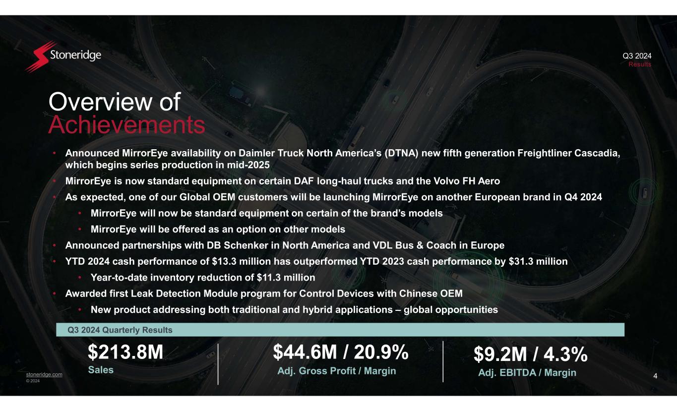 stoneridge.com © 2024 Q3 2024 Results 3 Non-GAAP Financial Measures This presentation contains information about the Company’s financial results that is not presented in accordance with accounting principles generally accepted in the United States (“GAAP”). Such non-GAAP financial measures are reconciled to their closest GAAP financial measures at the end of this presentation. The provision of these non-GAAP financial measures for 2024 and 2023 is not intended to indicate that Stoneridge is explicitly or implicitly providing projections on those non-GAAP financial measures, and actual results for such measures are likely to vary from those presented. The reconciliations include all information reasonably available to the Company at the date of this presentation and the adjustments that management can reasonably predict. Management believes the non-GAAP financial measures used in this presentation are useful to both management and investors in their analysis of the Company’s financial position and results of operations. In particular, management believes that adjusted gross income and margin, adjusted operating income and margin, adjusted income (loss) before tax, adjusted net income (loss), adjusted earnings (loss) per share, adjusted EBITDA, adjusted EBITDA margin, adjusted tax expense, adjusted tax rate, adjusted net debt and adjusted cash are useful measures in assessing the Company’s financial performance by excluding certain items that are not indicative of the Company’s core operating performance or that may obscure trends useful in evaluating the Company’s continuing operating activities. Management also believes that these measures are useful to both management and investors in their analysis of the Company’s results of operations and provide improved comparability between fiscal periods. Adjusted gross income and margin, adjusted operating income and margin, adjusted income (loss) before tax, adjusted net income (loss), adjusted earnings (loss) per share, adjusted EBITDA, adjusted EBITDA margin, adjusted tax expense, adjusted tax rate, adjusted net debt and adjusted cash should not be considered in isolation or as a substitute gross margin, operating income, income (loss) before tax, net income (loss), earnings per share, tax expense, tax rate, debt, cash and cash equivalents, cash provided by operating activities or other income statement or cash flow statement data prepared in accordance with GAAP. Q3 2024 Reported Q3 2024 Adjusted -$213.8 millionSales $44.6 million 20.9% $44.5 million 20.8% Gross Profit Margin $0.7 million 0.3% $0.3 million 0.1% Operating Income Margin $(0.24)$(0.26)EPS $3.5 million$3.4 millionIncome Tax Expense $9.2 million 4.3% -EBITDA Margin