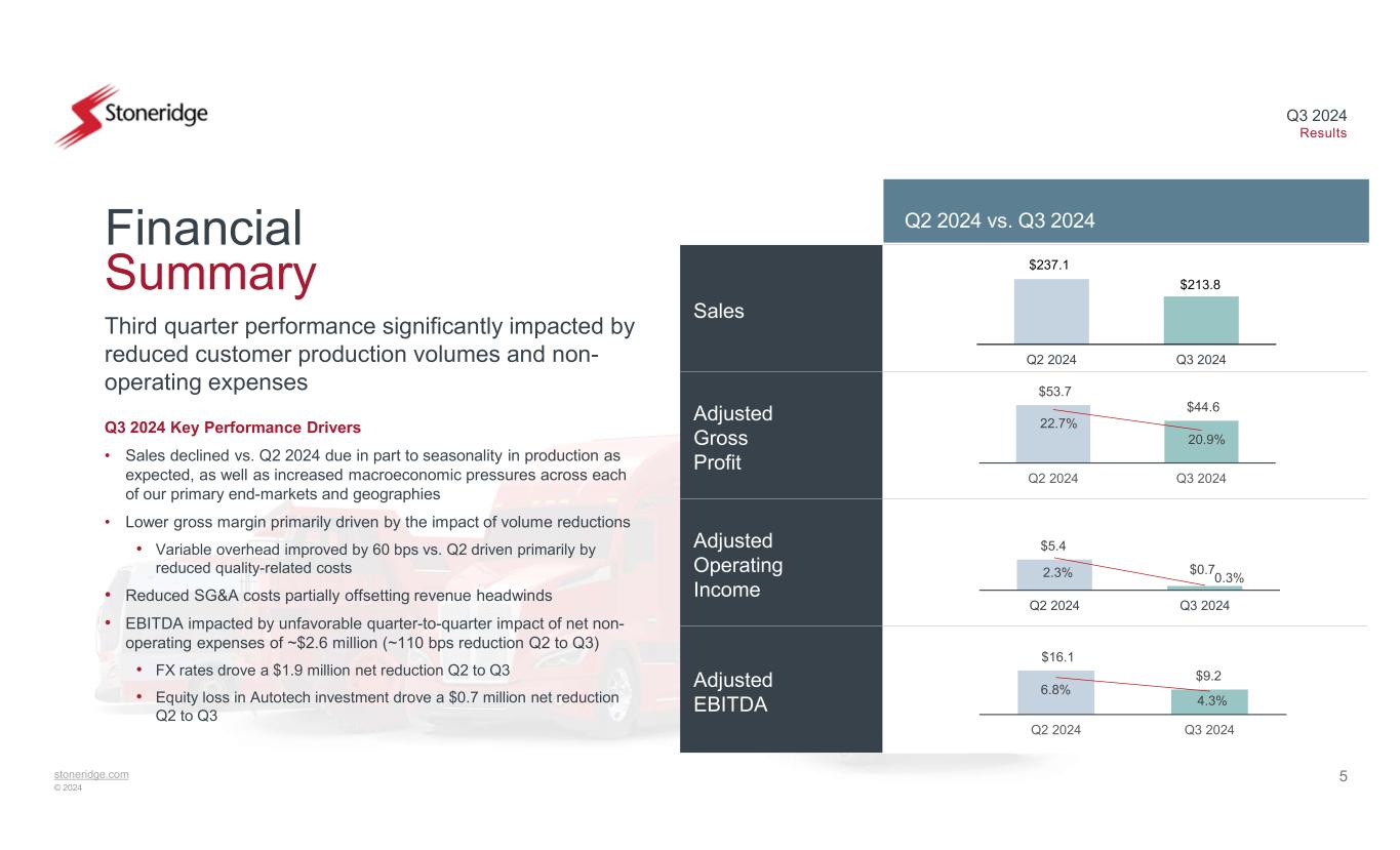 stoneridge.com © 2024 Q3 2024 Results • Announced MirrorEye availability on Daimler Truck North America’s (DTNA) new fifth generation Freightliner Cascadia, which begins series production in mid-2025 • MirrorEye is now standard equipment on certain DAF long-haul trucks and the Volvo FH Aero • As expected, one of our Global OEM customers will be launching MirrorEye on another European brand in Q4 2024 • MirrorEye will now be standard equipment on certain of the brand’s models • MirrorEye will be offered as an option on other models • Announced partnerships with DB Schenker in North America and VDL Bus & Coach in Europe • YTD 2024 cash performance of $13.3 million has outperformed YTD 2023 cash performance by $31.3 million • Year-to-date inventory reduction of $11.3 million • Awarded first Leak Detection Module program for Control Devices with Chinese OEM • New product addressing both traditional and hybrid applications – global opportunities Overview of Achievements Adj. Gross Profit / Margin $213.8M $44.6M / 20.9% Sales Q3 2024 Quarterly Results 4Adj. EBITDA / Margin $9.2M / 4.3%