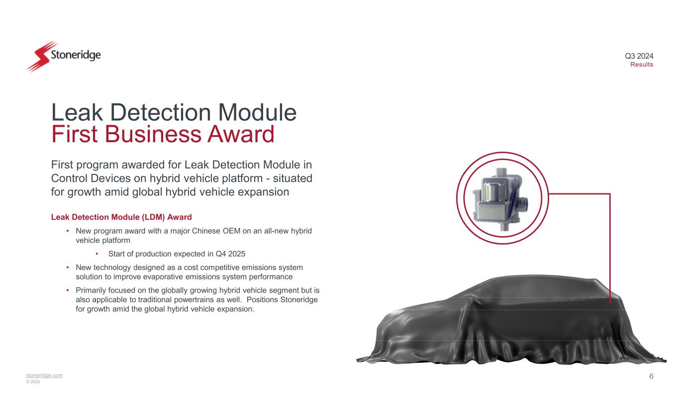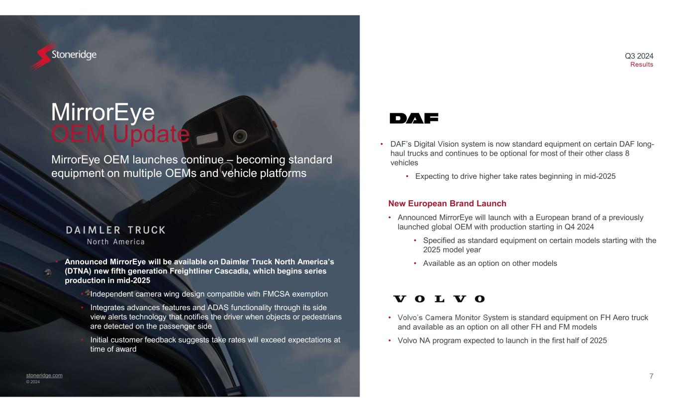 stoneridge.com © 2024 Q3 2024 Results 6 First program awarded for Leak Detection Module in Control Devices on hybrid vehicle platform - situated for growth amid global hybrid vehicle expansion Leak Detection Module First Business Award Leak Detection Module (LDM) Award • New program award with a major Chinese OEM on an all-new hybrid vehicle platform • Start of production expected in Q4 2025 • New technology designed as a cost competitive emissions system solution to improve evaporative emissions system performance • Primarily focused on the globally growing hybrid vehicle segment but is also applicable to traditional powertrains as well. Positions Stoneridge for growth amid the global hybrid vehicle expansion.