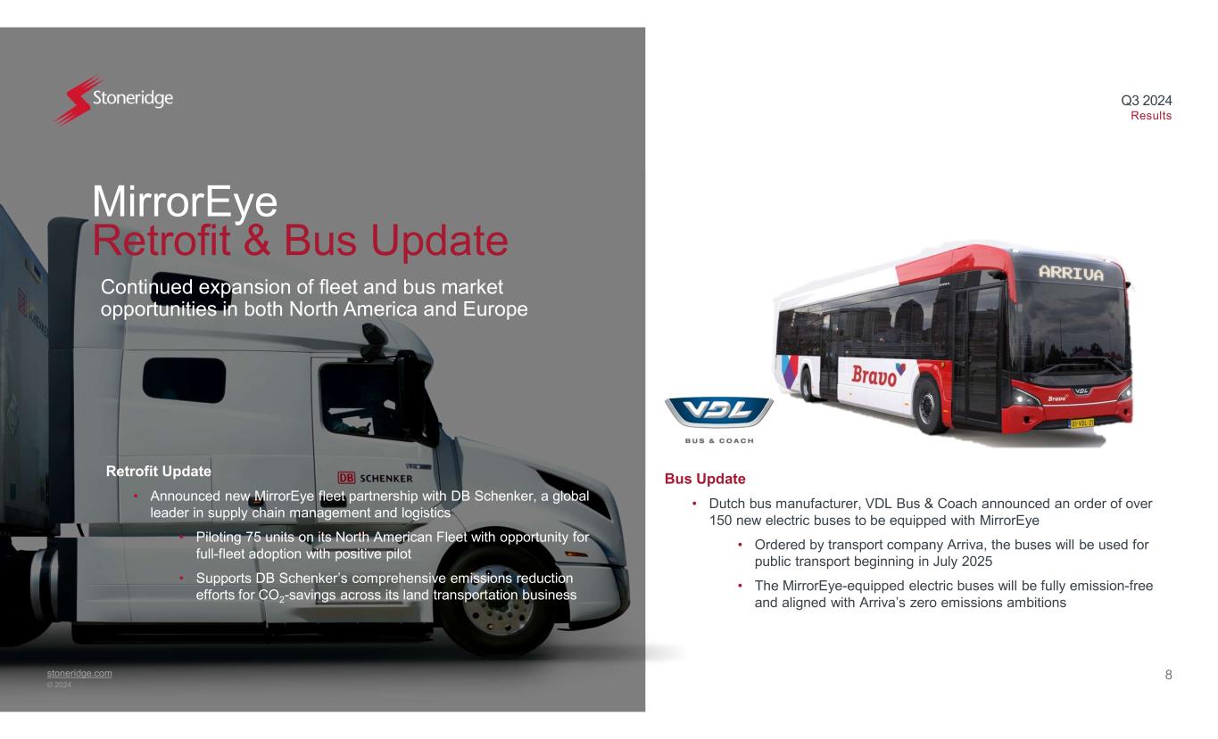 stoneridge.com © 2024 Q3 2024 Results 7 MirrorEye OEM launches continue – becoming standard equipment on multiple OEMs and vehicle platforms MirrorEye OEM Update • Announced MirrorEye will be available on Daimler Truck North America’s (DTNA) new fifth generation Freightliner Cascadia, which begins series production in mid-2025 • Independent camera wing design compatible with FMCSA exemption • Integrates advances features and ADAS functionality through its side view alerts technology that notifies the driver when objects or pedestrians are detected on the passenger side • Initial customer feedback suggests take rates will exceed expectations at time of award New European Brand Launch • Announced MirrorEye will launch with a European brand of a previously launched global OEM with production starting in Q4 2024 • Specified as standard equipment on certain models starting with the 2025 model year • Available as an option on other models • Volvo’s Camera Monitor System is standard equipment on FH Aero truck and available as an option on all other FH and FM models • Volvo NA program expected to launch in the first half of 2025 • DAF’s Digital Vision system is now standard equipment on certain DAF long- haul trucks and continues to be optional for most of their other class 8 vehicles • Expecting to drive higher take rates beginning in mid-2025