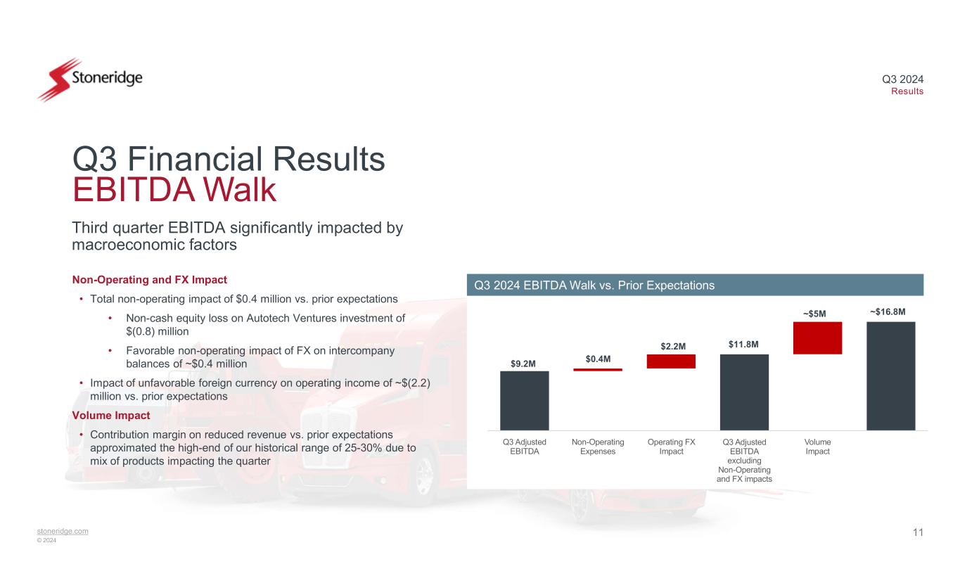 10stoneridge.com © 2024 Q3 2024 Results Q3 2024 Financial Highlights Q3 2024 Reported -$213.8 million Sales $44.6 million 20.9% $44.5 million 20.8% Gross Profit Margin $0.7 million 0.3% $0.3 million 0.1% Operating Income Margin $(0.24)$(0.26)EPS $3.5 million$3.4 million Income Tax Expense $9.2 million 4.3% - EBITDA Margin Key Performance Drivers • Production volume headwinds across each of our primary end-markets • Lower gross margin primarily driven by the impact of reduced revenue • Variable overhead improved by 60 bps vs. Q2 driven primarily by reduced quality-related costs • Non-operating equity loss on Autotech investment of $(0.8) million partially offset by favorable non-operating FX impact of $0.4 million • Unfavorable income tax expense primarily due to jurisdictional earnings mix and deterioration of earnings • Cash performance improved by $31.3 million year-to-date vs. the same period in 2023 • Inventory reduced by $11.3 million in the first nine months of 2024 Third quarter performance significantly impacted by reduced customer production volumes Q3 2024 Adjusted