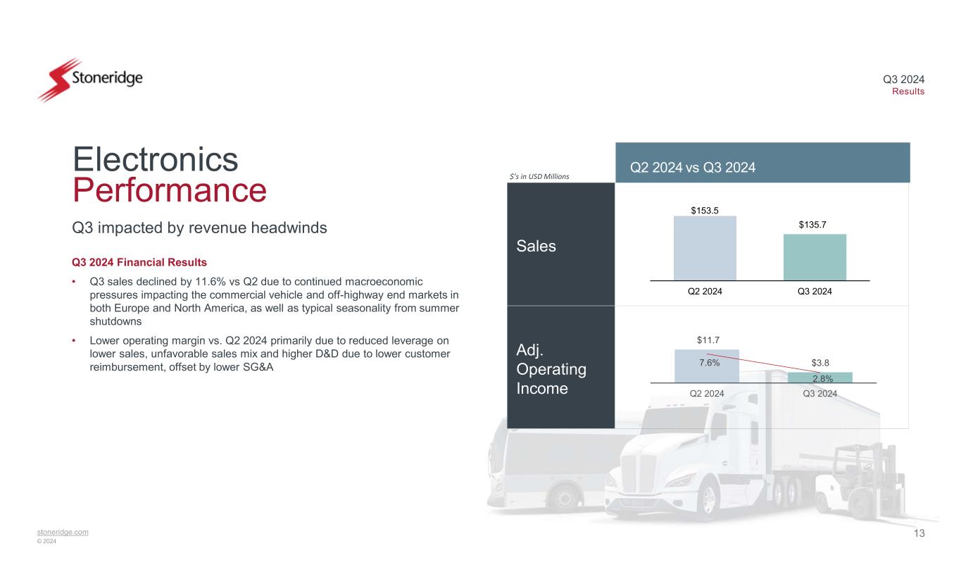 12stoneridge.com © 2024 Q3 2024 Results Sales Adj. Operating Income $’s in USD Millions Continued focus on operational excellence and operating cost control to offset production volume headwinds Control Devices Performance 2.2% 2.2% Q2 2024 vs Q3 2024 Q3 2024 Financial Results • Lower sales vs. Q2 2024 due to lower production volumes in the North American passenger vehicle end market primarily due to reduced demand • Material costs declined by 20 basis points vs. Q2 2024 as we continue to focus on material cost improvement to drive margin performance • Q3 2024 operating margin decreased vs. Q2 2024 primarily due to reduced leverage on lower sales slightly offset by lower material costs $80.9 $74.3 Q2 2024 Q3 2024 $3.7 $2.3 4.6% 3.1% 0% 5% 0 2 4 Q2 2024 Q3 2024