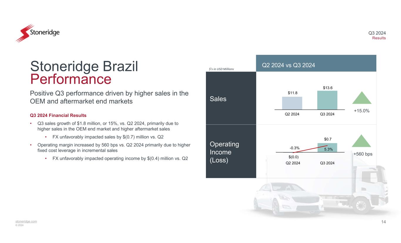 13stoneridge.com © 2024 Q3 2024 Results Sales Adj. Operating Income Q2 2024 vs Q3 2024 $’s in USD Millions Q3 impacted by revenue headwinds Electronics Performance Q3 2024 Financial Results • Q3 sales declined by 11.6% vs Q2 due to continued macroeconomic pressures impacting the commercial vehicle and off-highway end markets in both Europe and North America, as well as typical seasonality from summer shutdowns • Lower operating margin vs. Q2 2024 primarily due to reduced leverage on lower sales, unfavorable sales mix and higher D&D due to lower customer reimbursement, offset by lower SG&A $153.5 $135.7 Q2 2024 Q3 2024 $11.7 $3.8 7.6% 2.8% 0.0% 5.0% 10.0% 15.0% Q2 2024 Q3 2024