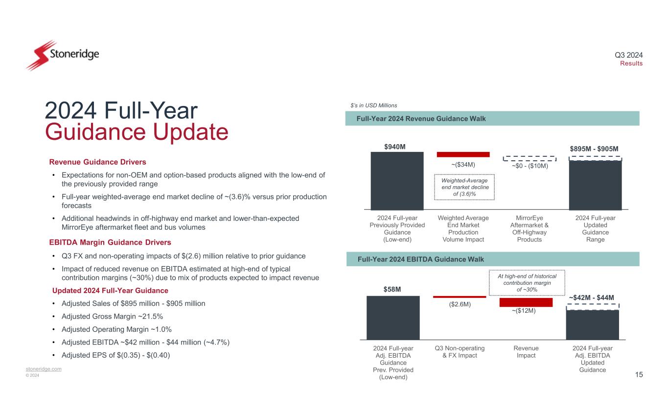 14stoneridge.com © 2024 Q3 2024 Results Sales Operating Income (Loss) Q2 2024 vs Q3 2024 $’s in USD Millions Positive Q3 performance driven by higher sales in the OEM and aftermarket end markets Stoneridge Brazil Performance Q3 2024 Financial Results • Q3 sales growth of $1.8 million, or 15%, vs. Q2 2024, primarily due to higher sales in the OEM end market and higher aftermarket sales • FX unfavorably impacted sales by $(0.7) million vs. Q2 • Operating margin increased by 560 bps vs. Q2 2024 primarily due to higher fixed cost leverage in incremental sales • FX unfavorably impacted operating income by $(0.4) million vs. Q2 +15.0% +560 bps $11.8 $13.6 Q2 2024 Q3 2024 $(0.0) $0.7 -0.3% 5.3% Q2 2024 Q3 2024