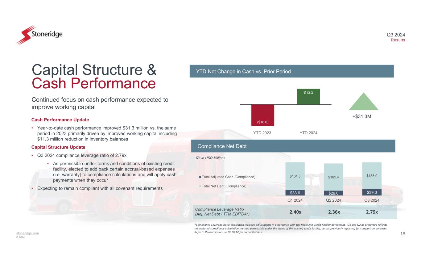 stoneridge.com © 2024 Q3 2024 Results 2024 Full-year Previously Provided Guidance (Low-end) Weighted Average End Market Production Volume Impact MirrorEye Aftermarket & Off-Highway Products 2024 Full-year Updated Guidance Range 2024 Full-year Adj. EBITDA Guidance Prev. Provided (Low-end) Q3 Non-operating & FX Impact Revenue Impact 2024 Full-year Adj. EBITDA Updated Guidance 2024 Full-Year Guidance Update Revenue Guidance Drivers • Expectations for non-OEM and option-based products aligned with the low-end of the previously provided range • Full-year weighted-average end market decline of ~(3.6)% versus prior production forecasts • Additional headwinds in off-highway end market and lower-than-expected MirrorEye aftermarket fleet and bus volumes EBITDA Margin Guidance Drivers • Q3 FX and non-operating impacts of $(2.6) million relative to prior guidance • Impact of reduced revenue on EBITDA estimated at high-end of typical contribution margins (~30%) due to mix of products expected to impact revenue Updated 2024 Full-Year Guidance • Adjusted Sales of $895 million - $905 million • Adjusted Gross Margin ~21.5% • Adjusted Operating Margin ~1.0% • Adjusted EBITDA ~$42 million - $44 million (~4.7%) • Adjusted EPS of $(0.35) - $(0.40) $’s in USD Millions $895M - $905M ~($34M) Full-Year 2024 Revenue Guidance Walk Full-Year 2024 EBITDA Guidance Walk $58M At high-end of historical contribution margin of ~30% 15 $940M ~$42M - $44M ~($12M) ($2.6M) Weighted-Average end market decline of (3.6)% ~$0 - ($10M)