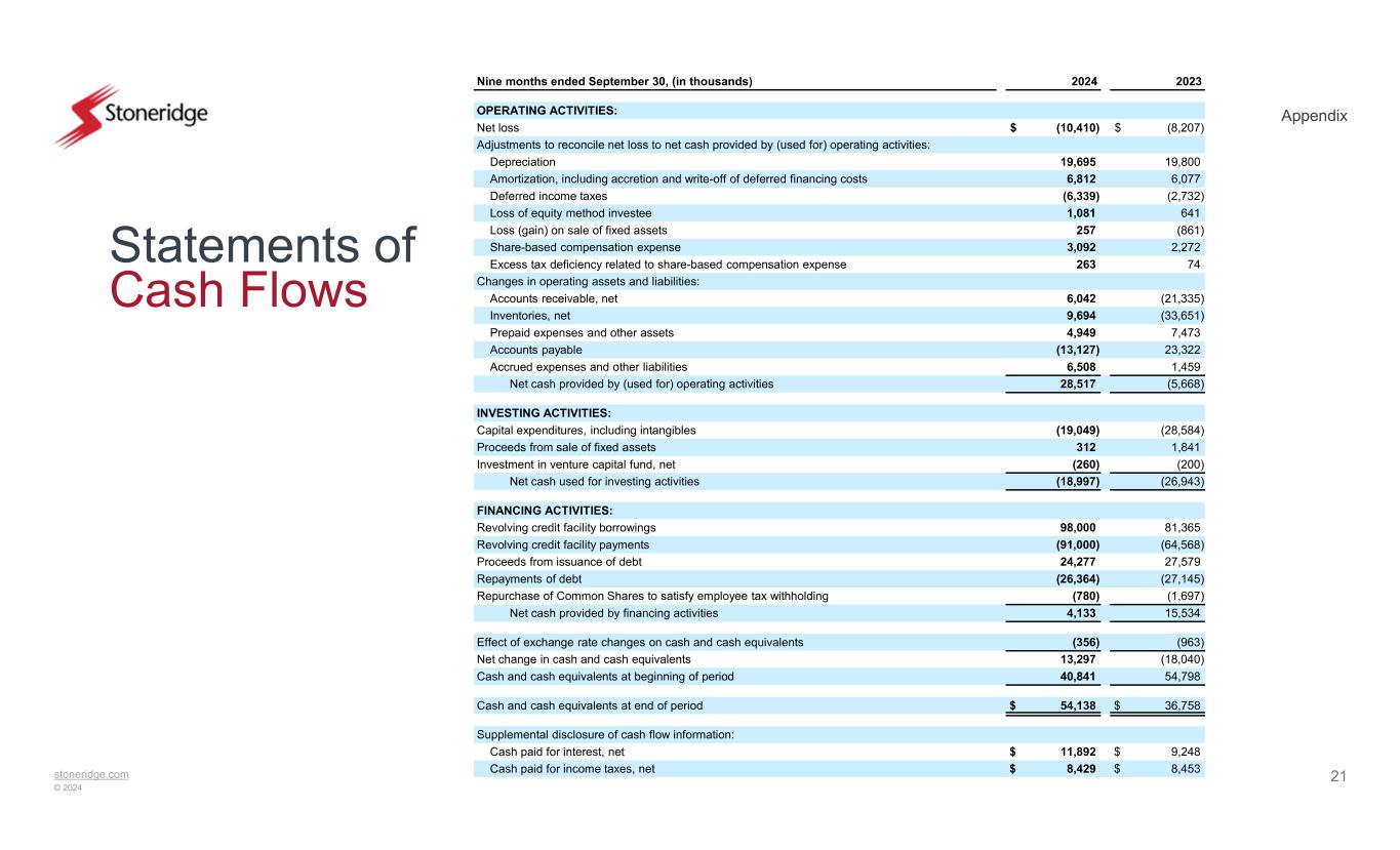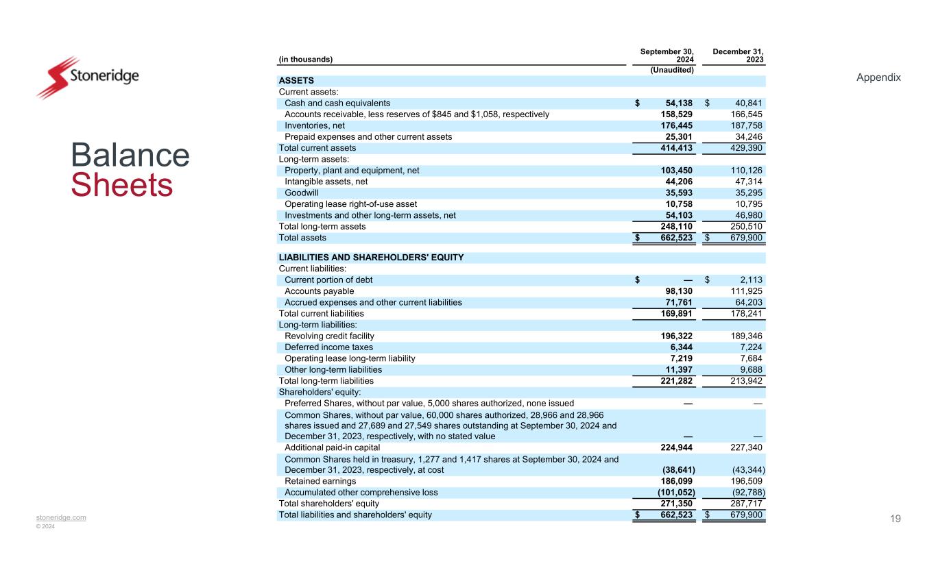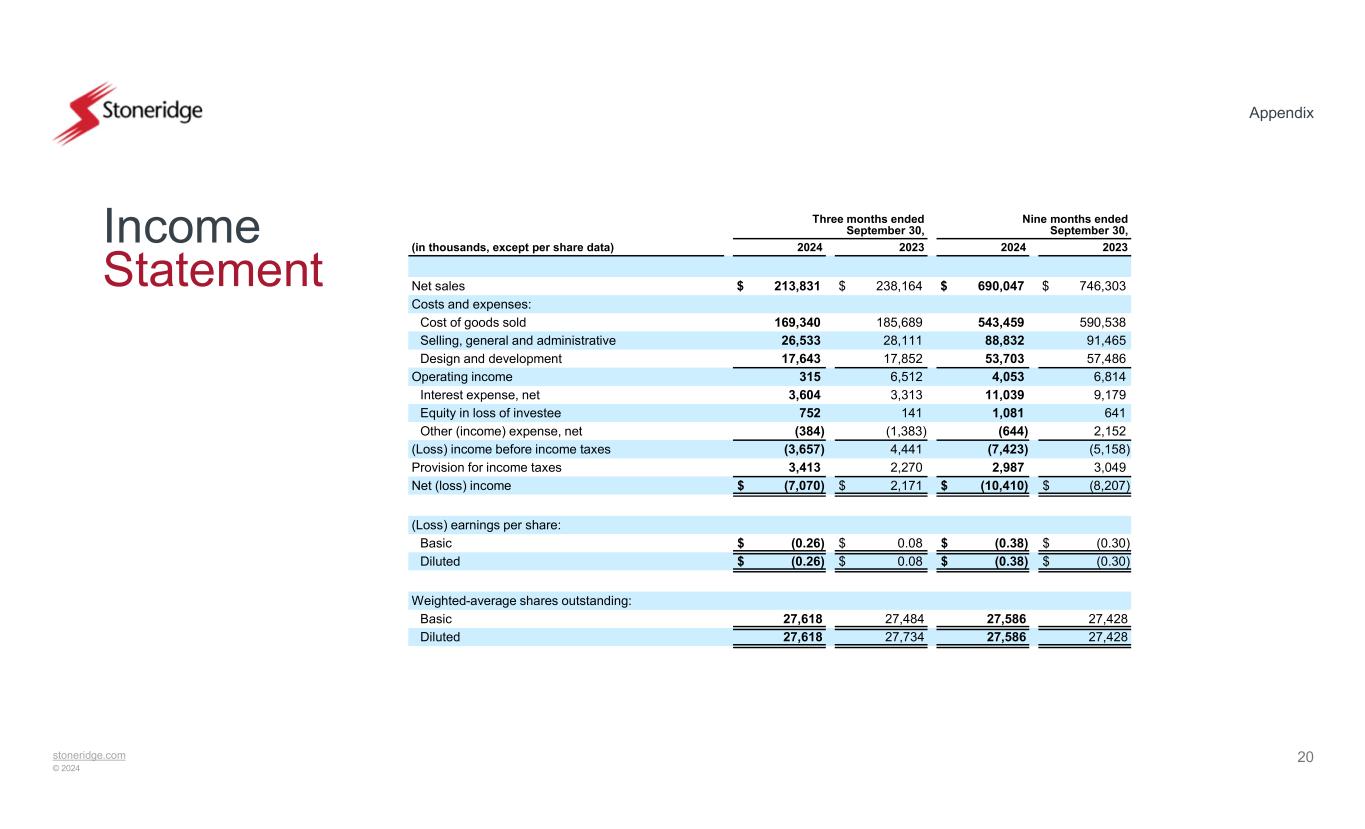 stoneridge.com © 2024 Appendix 19 Balance Sheets December 31, 2023 September 30, 2024(in thousands) (Unaudited) ASSETS Current assets: $ 40,841$ 54,138Cash and cash equivalents 166,545158,529Accounts receivable, less reserves of $845 and $1,058, respectively 187,758176,445Inventories, net 34,24625,301Prepaid expenses and other current assets 429,390414,413Total current assets Long-term assets: 110,126103,450Property, plant and equipment, net 47,31444,206Intangible assets, net 35,29535,593Goodwill 10,79510,758Operating lease right-of-use asset 46,98054,103Investments and other long-term assets, net 250,510248,110Total long-term assets $ 679,900$ 662,523Total assets LIABILITIES AND SHAREHOLDERS' EQUITY Current liabilities: $ 2,113$ —Current portion of debt 111,92598,130Accounts payable 64,20371,761Accrued expenses and other current liabilities 178,241169,891Total current liabilities Long-term liabilities: 189,346196,322Revolving credit facility 7,2246,344Deferred income taxes 7,6847,219Operating lease long-term liability 9,68811,397Other long-term liabilities 213,942221,282Total long-term liabilities Shareholders' equity: ——Preferred Shares, without par value, 5,000 shares authorized, none issued —— Common Shares, without par value, 60,000 shares authorized, 28,966 and 28,966 shares issued and 27,689 and 27,549 shares outstanding at September 30, 2024 and December 31, 2023, respectively, with no stated value 227,340224,944Additional paid-in capital (43,344)(38,641) Common Shares held in treasury, 1,277 and 1,417 shares at September 30, 2024 and December 31, 2023, respectively, at cost 196,509186,099Retained earnings (92,788)(101,052)Accumulated other comprehensive loss 287,717271,350Total shareholders' equity $ 679,900$ 662,523Total liabilities and shareholders' equity