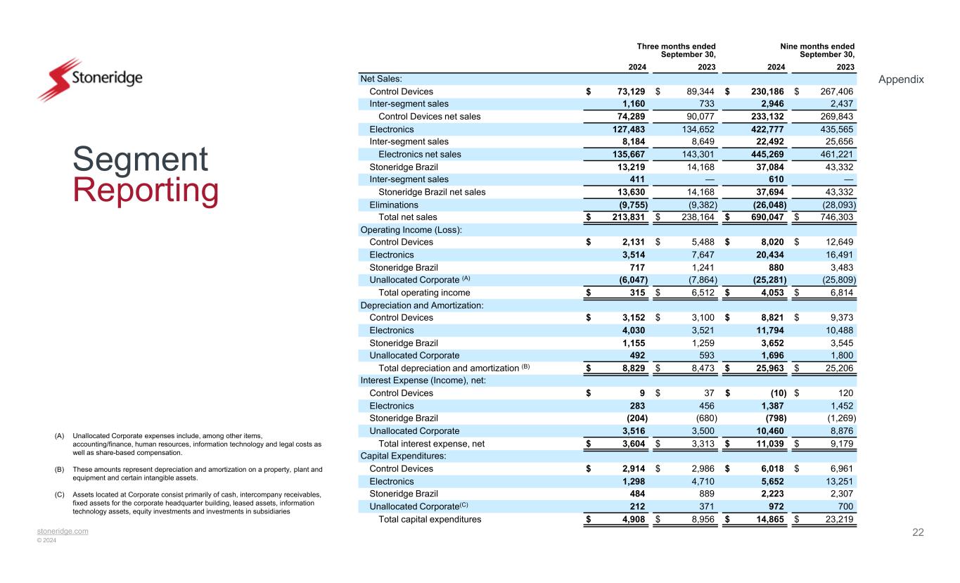 stoneridge.com © 2024 Appendix 22 Segment Reporting (A) Unallocated Corporate expenses include, among other items, accounting/finance, human resources, information technology and legal costs as well as share-based compensation. (B) These amounts represent depreciation and amortization on a property, plant and equipment and certain intangible assets. (C) Assets located at Corporate consist primarily of cash, intercompany receivables, fixed assets for the corporate headquarter building, leased assets, information technology assets, equity investments and investments in subsidiaries Nine months ended September 30, Three months ended September 30, 2023202420232024 Net Sales: $ 267,406$ 230,186$ 89,344$ 73,129Control Devices 2,4372,9467331,160Inter-segment sales 269,843233,13290,07774,289Control Devices net sales 435,565422,777134,652127,483Electronics 25,65622,4928,6498,184Inter-segment sales 461,221445,269143,301135,667Electronics net sales 43,33237,08414,16813,219Stoneridge Brazil —610—411Inter-segment sales 43,33237,69414,16813,630Stoneridge Brazil net sales (28,093)(26,048)(9,382)(9,755)Eliminations $ 746,303$ 690,047$ 238,164$ 213,831Total net sales Operating Income (Loss): $ 12,649$ 8,020$ 5,488$ 2,131Control Devices 16,49120,4347,6473,514Electronics 3,4838801,241717Stoneridge Brazil (25,809)(25,281)(7,864)(6,047)Unallocated Corporate (A) $ 6,814$ 4,053$ 6,512$ 315Total operating income Depreciation and Amortization: $ 9,373$ 8,821$ 3,100$ 3,152Control Devices 10,48811,7943,5214,030Electronics 3,5453,6521,2591,155Stoneridge Brazil 1,8001,696593492Unallocated Corporate $ 25,206$ 25,963$ 8,473$ 8,829Total depreciation and amortization (B) Interest Expense (Income), net: $ 120$ (10)$ 37$ 9Control Devices 1,4521,387456283Electronics (1,269)(798)(680)(204)Stoneridge Brazil 8,87610,4603,5003,516Unallocated Corporate $ 9,179$ 11,039$ 3,313$ 3,604Total interest expense, net Capital Expenditures: $ 6,961$ 6,018$ 2,986$ 2,914Control Devices 13,2515,6524,7101,298Electronics 2,3072,223889484Stoneridge Brazil 700972371212Unallocated Corporate(C) $ 23,219$ 14,865$ 8,956$ 4,908Total capital expenditures