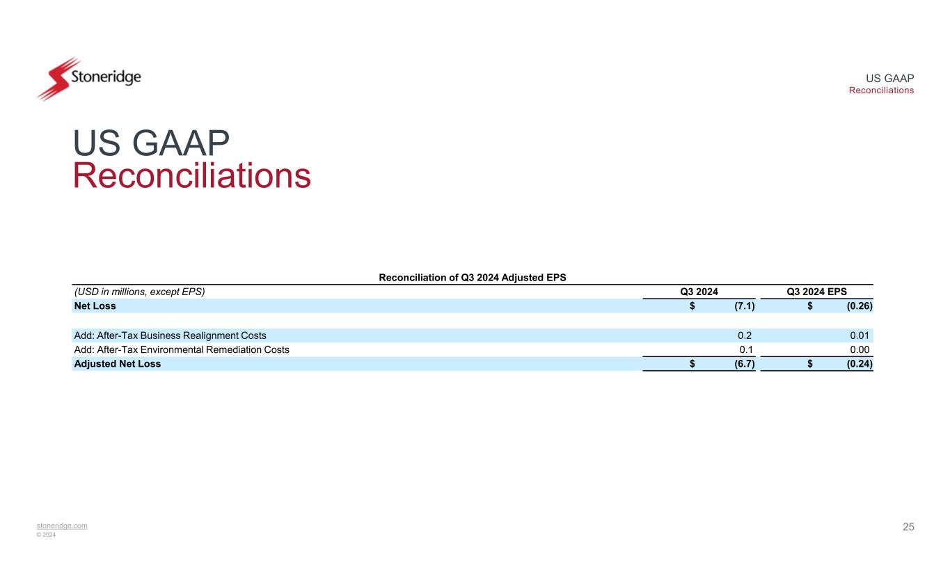 stoneridge.com © 2024 US GAAP Reconciliations US GAAP Reconciliations 24 This document contains information about Stoneridge's financial results which is not presented in accordance with accounting principles generally accepted in the United States ("GAAP"). Such non-GAAP financial measures are reconciled to their closest GAAP financial measures in the appendix of this document. The provision of these non-GAAP financial measures is not intended to indicate that Stoneridge is explicitly or implicitly providing projections on those non- GAAP financial measures, and actual results for such measures are likely to vary from those presented. The reconciliations include all information reasonably available to the Company at the date of this document and the adjustments that management can reasonably predict.