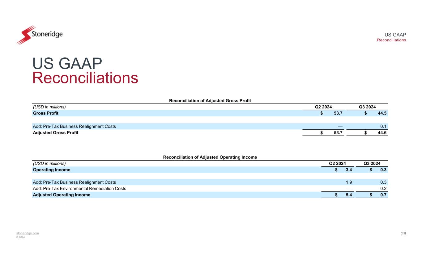 stoneridge.com © 2024 US GAAP Reconciliations 25 US GAAP Reconciliations Reconciliation of Q3 2024 Adjusted EPS Q3 2024 EPSQ3 2024(USD in millions, except EPS) $ (0.26)$ (7.1)Net Loss 0.010.2Add: After-Tax Business Realignment Costs 0.000.1Add: After-Tax Environmental Remediation Costs $ (0.24)$ (6.7)Adjusted Net Loss