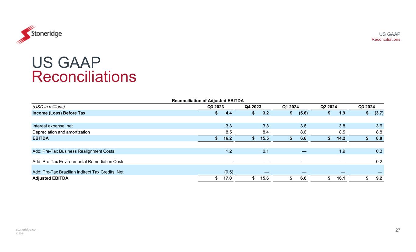 stoneridge.com © 2024 US GAAP Reconciliations 26 US GAAP Reconciliations Reconciliation of Adjusted Gross Profit Q3 2024Q2 2024(USD in millions) $ 44.5$ 53.7Gross Profit 0.1—Add: Pre-Tax Business Realignment Costs $ 44.6$ 53.7Adjusted Gross Profit Reconciliation of Adjusted Operating Income Q3 2024Q2 2024(USD in millions) $ 0.3$ 3.4Operating Income 0.31.9Add: Pre-Tax Business Realignment Costs 0.2—Add: Pre-Tax Environmental Remediation Costs $ 0.7$ 5.4Adjusted Operating Income