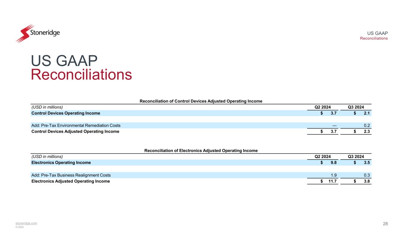 stoneridge.com © 2024 US GAAP Reconciliations 27 US GAAP Reconciliations Reconciliation of Adjusted EBITDA Q3 2024Q2 2024Q1 2024Q4 2023Q3 2023(USD in millions) $ (3.7)$ 1.9$ (5.6)$ 3.2$ 4.4Income (Loss) Before Tax 3.63.83.63.83.3Interest expense, net 8.88.58.68.48.5Depreciation and amortization $ 8.8$ 14.2$ 6.6$ 15.5$ 16.2EBITDA 0.31.9—0.11.2Add: Pre-Tax Business Realignment Costs 0.2————Add: Pre-Tax Environmental Remediation Costs ————(0.5)Add: Pre-Tax Brazilian Indirect Tax Credits, Net $ 9.2$ 16.1$ 6.6$ 15.6$ 17.0Adjusted EBITDA