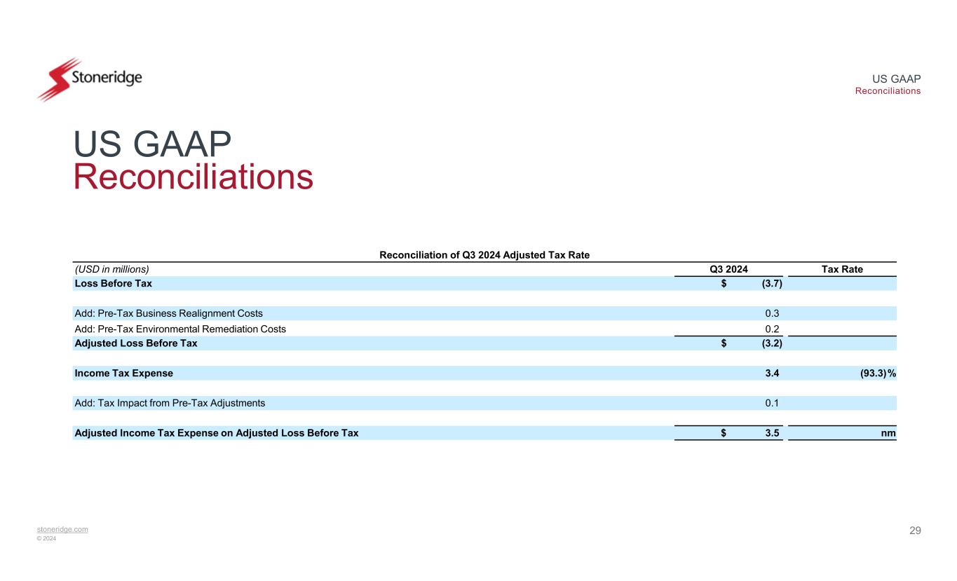 stoneridge.com © 2024 US GAAP Reconciliations 28 US GAAP Reconciliations Reconciliation of Control Devices Adjusted Operating Income Q3 2024Q2 2024(USD in millions) $ 2.1$ 3.7Control Devices Operating Income 0.2—Add: Pre-Tax Environmental Remediation Costs $ 2.3$ 3.7Control Devices Adjusted Operating Income Reconciliation of Electronics Adjusted Operating Income Q3 2024Q2 2024(USD in millions) $ 3.5$ 9.8Electronics Operating Income 0.31.9Add: Pre-Tax Business Realignment Costs $ 3.8$ 11.7Electronics Adjusted Operating Income