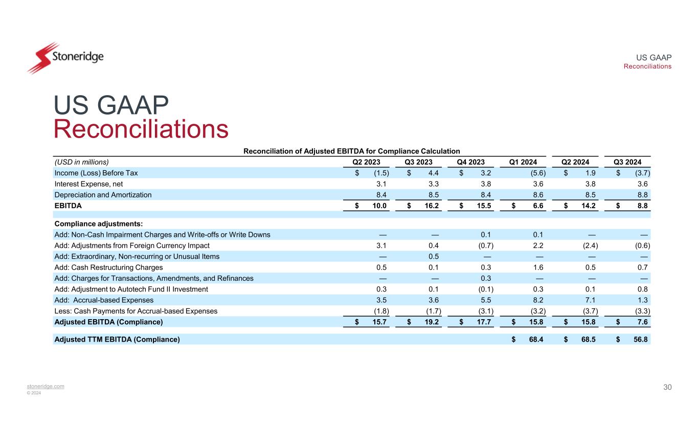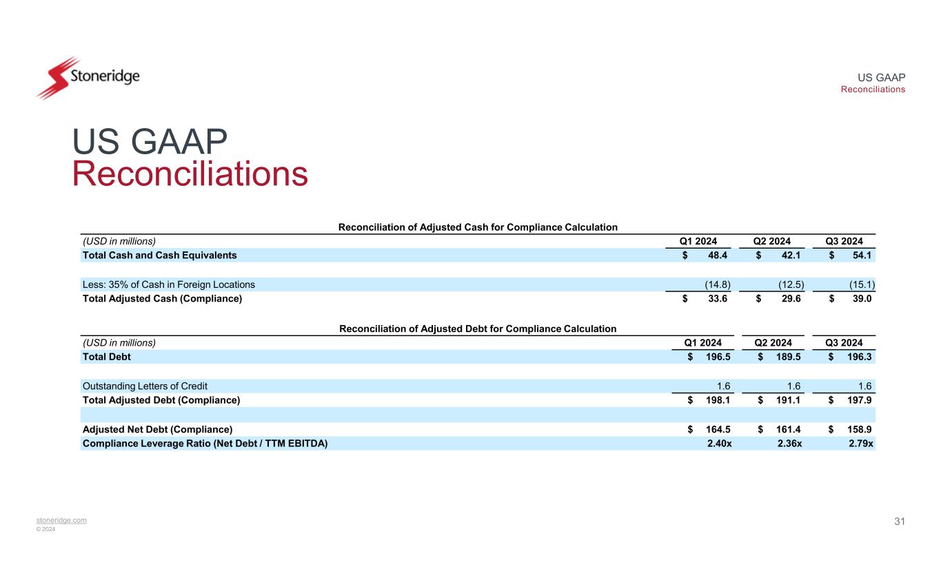 stoneridge.com © 2024 US GAAP Reconciliations 30 US GAAP Reconciliations Reconciliation of Adjusted EBITDA for Compliance Calculation Q3 2024Q2 2024Q1 2024Q4 2023Q3 2023Q2 2023(USD in millions) $ (3.7)$ 1.9(5.6)$ 3.2$ 4.4$ (1.5)Income (Loss) Before Tax 3.63.83.63.83.33.1Interest Expense, net 8.88.58.68.48.58.4Depreciation and Amortization $ 8.8$ 14.2$ 6.6$ 15.5$ 16.2$ 10.0EBITDA Compliance adjustments: ——0.10.1——Add: Non-Cash Impairment Charges and Write-offs or Write Downs (0.6)(2.4)2.2(0.7)0.43.1Add: Adjustments from Foreign Currency Impact ————0.5—Add: Extraordinary, Non-recurring or Unusual Items 0.70.51.60.30.10.5Add: Cash Restructuring Charges ———0.3——Add: Charges for Transactions, Amendments, and Refinances 0.80.10.3(0.1)0.10.3Add: Adjustment to Autotech Fund II Investment 1.37.18.25.53.63.5Add: Accrual-based Expenses (3.3)(3.7)(3.2)(3.1)(1.7)(1.8)Less: Cash Payments for Accrual-based Expenses $ 7.6$ 15.8$ 15.8$ 17.7$ 19.2$ 15.7Adjusted EBITDA (Compliance) $ 56.8$ 68.5$ 68.4Adjusted TTM EBITDA (Compliance)