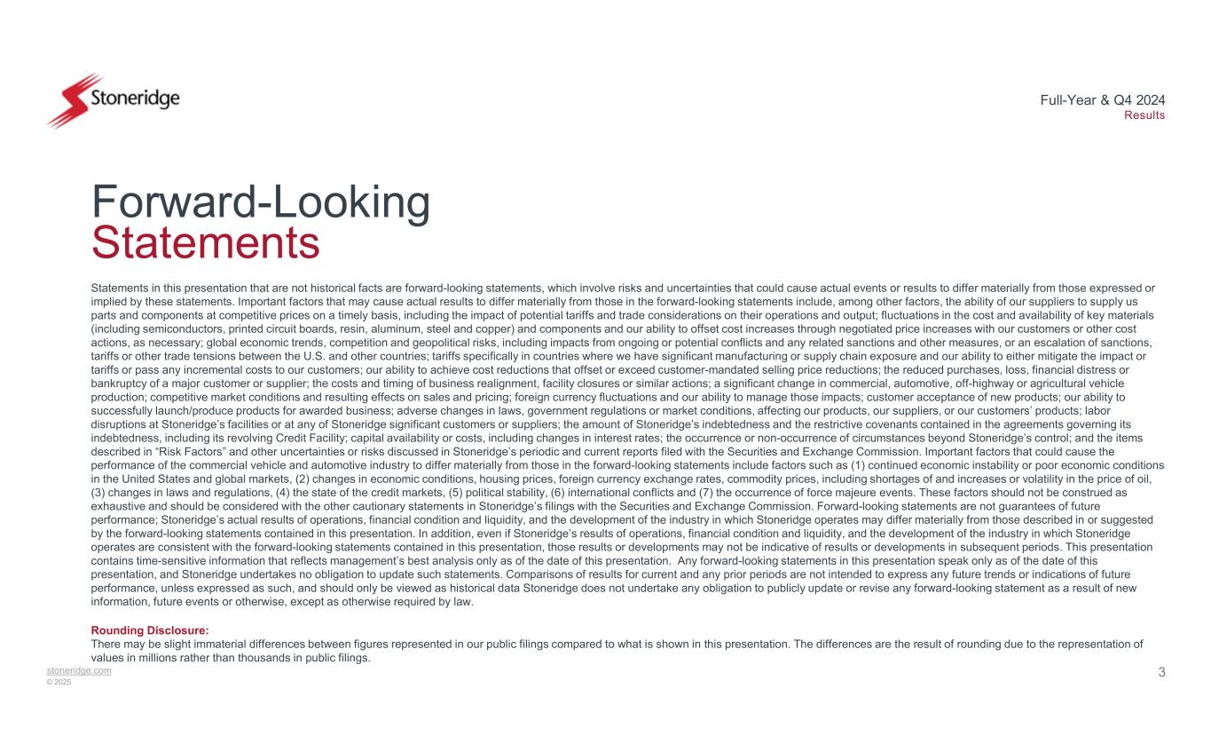 stoneridge.com © 2025 Full-Year & Q4 2024 Results 2 Non-GAAP Financial Measures This presentation contains information about the Company’s financial results that is not presented in accordance with accounting principles generally accepted in the United States (“GAAP”). Such non-GAAP financial measures are reconciled to their closest GAAP financial measures at the end of this presentation. The provision of these non-GAAP financial measures for 2024 and 2023 is not intended to indicate that Stoneridge is explicitly or implicitly providing projections on those non-GAAP financial measures, and actual results for such measures are likely to vary from those presented. The reconciliations include all information reasonably available to the Company at the date of this presentation and the adjustments that management can reasonably predict. Management believes the non-GAAP financial measures used in this presentation are useful to both management and investors in their analysis of the Company’s financial position and results of operations. In particular, management believes that adjusted gross profit and margin, adjusted operating income (loss) and margin, adjusted income (loss) before tax, adjusted net income (loss), adjusted earnings (loss) per share, adjusted EBITDA, adjusted EBITDA margin, adjusted tax expense (benefit), adjusted net debt, adjusted debt, adjusted cash and free cash flow are useful measures in assessing the Company’s financial performance by excluding certain items that are not indicative of the Company’s core operating performance or that may obscure trends useful in evaluating the Company’s continuing operating activities. Management also believes that these measures are useful to both management and investors in their analysis of the Company’s results of operations and provide improved comparability between fiscal periods. Adjusted gross profit and margin, adjusted operating income (loss) and margin, adjusted income (loss) before tax, adjusted net income (loss), adjusted earnings (loss) per share, adjusted EBITDA, adjusted EBITDA margin, adjusted tax expense (benefit), adjusted net debt, adjusted debt, adjusted cash and free cash flow should not be considered in isolation or as a substitute for gross profit, operating income (loss), income (loss) before tax, net income (loss), earnings per share, tax expense (benefit), debt, cash and cash equivalents, cash provided by operating activities or other income statement or cash flow statement data prepared in accordance with GAAP. Q4 Reported Q4 Adjusted / Non-GAAP Full-Year Reported Full-Year Adjusted / Non-GAAP -$908.3 million-$218.2 million Sales $189.8 million 20.9% $189.3 million 20.8% $43.1 million 19.7% $42.7 million 19.5% Gross Profit Margin $2.4 million 0.3% $(0.4) million 0.0% $(4.0) million (1.8)% $(4.4) million (2.0)% Operating Income (Loss) Margin $(13.1) million (1.4)% $(16.5) million (1.8)% $(5.0) million (2.3)% $(6.1) million (2.8)% Net Income (Loss) % of sales $(0.47)$(0.60) $(0.18)$(0.22)EPS $37.9 million 4.2% -$6.0 million 2.7% -EBITDA Margin -$47.7 millionNet Cash Provided by Operating Activities $23.8 million-Free Cash Flow