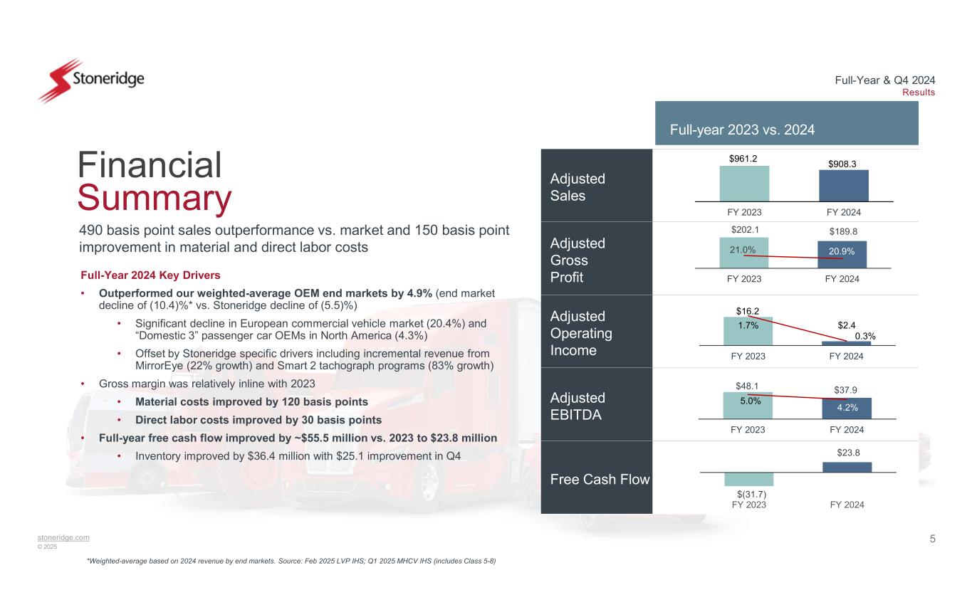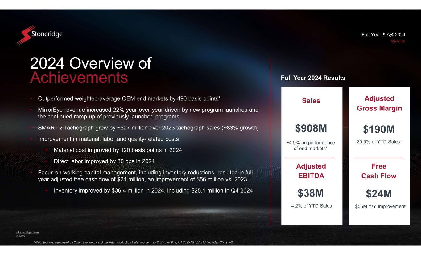 stoneridge.com © 2025 Full-Year & Q4 2024 Results • Outperformed weighted-average OEM end markets by 490 basis points* • MirrorEye revenue increased 22% year-over-year driven by new program launches and the continued ramp-up of previously launched programs • SMART 2 Tachograph grew by ~$27 million over 2023 tachograph sales (~83% growth) • Improvement in material, labor and quality-related costs • Material cost improved by 120 basis points in 2024 • Direct labor improved by 30 bps in 2024 • Focus on working capital management, including inventory reductions, resulted in full- year adjusted free cash flow of $24 million, an improvement of $56 million vs. 2023 • Inventory improved by $36.4 million in 2024, including $25.1 million in Q4 2024 2024 Overview of Achievements Sales $908M ~4.9% outperformance of end markets* Full Year 2024 Results 20.9% of YTD Sales $190M Adjusted EBITDA $38M 4.2% of YTD Sales Free Cash Flow Adjusted Gross Margin $24M $56M Y/Y Improvement *Weighted-average based on 2024 revenue by end markets. Production Data Source: Feb 2025 LVP IHS; Q1 2025 MHCV IHS (includes Class 5-8)
