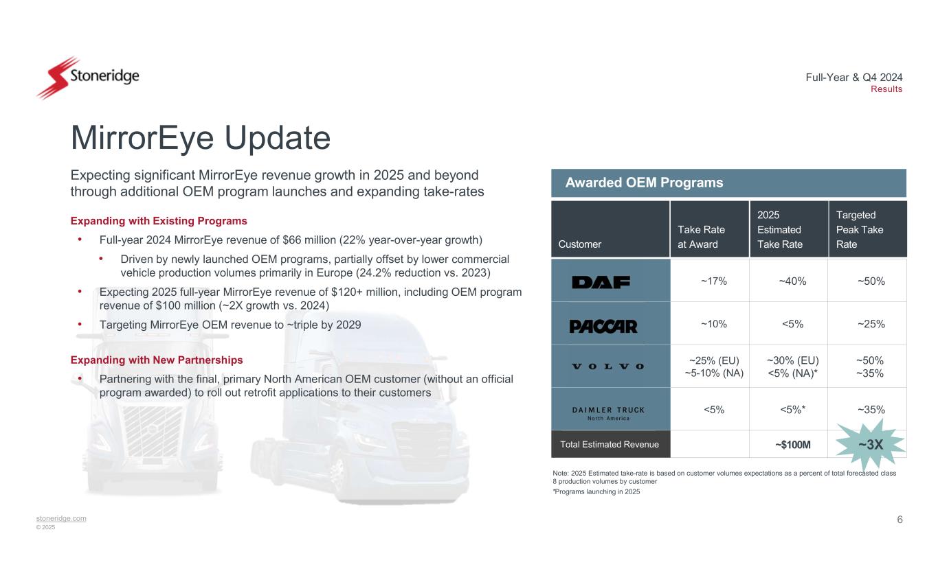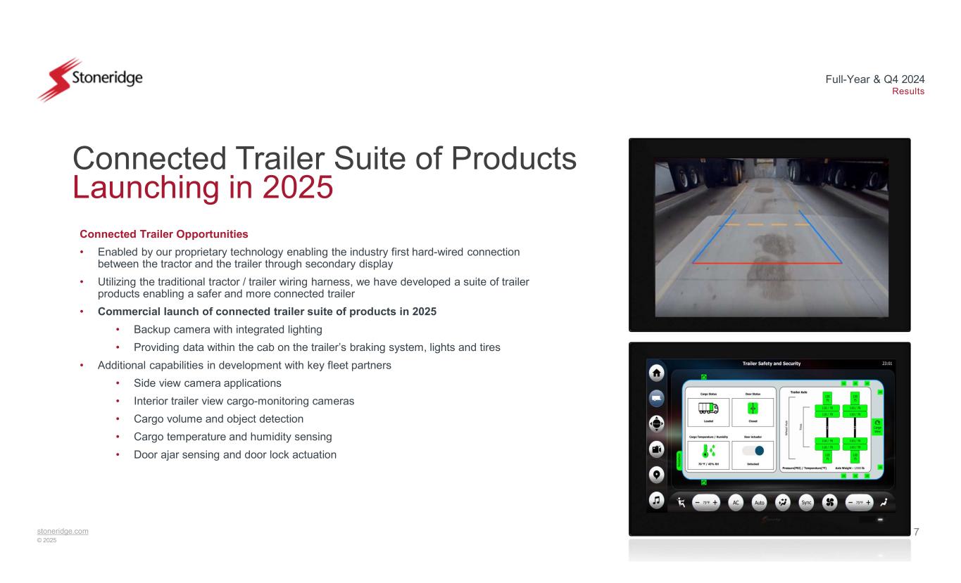 6stoneridge.com © 2025 Full-Year & Q4 2024 Results MirrorEye Update ~50%~40%~17% ~25%<5%~10% ~50% ~35% ~30% (EU) <5% (NA)* ~25% (EU) ~5-10% (NA) ~35%<5%*<5% ~$100MTotal Estimated Revenue Expanding with Existing Programs • Full-year 2024 MirrorEye revenue of $66 million (22% year-over-year growth) • Driven by newly launched OEM programs, partially offset by lower commercial vehicle production volumes primarily in Europe (24.2% reduction vs. 2023) • Expecting 2025 full-year MirrorEye revenue of $120+ million, including OEM program revenue of $100 million (~2X growth vs. 2024) • Targeting MirrorEye OEM revenue to ~triple by 2029 Expanding with New Partnerships • Partnering with the final, primary North American OEM customer (without an official program awarded) to roll out retrofit applications to their customers Expecting significant MirrorEye revenue growth in 2025 and beyond through additional OEM program launches and expanding take-rates Take Rate at Award 2025 Estimated Take Rate Targeted Peak Take RateCustomer *Programs launching in 2025 ~3X Note: 2025 Estimated take-rate is based on customer volumes expectations as a percent of total forecasted class 8 production volumes by customer Awarded OEM Programs