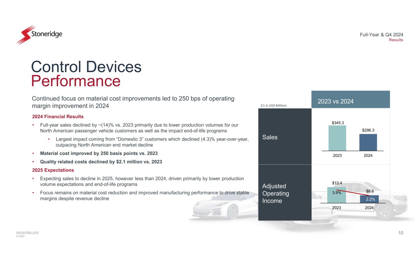 9stoneridge.com © 2025 Full-Year & Q4 2024 Results $6.0 $3.1 $2.1 $11.1 2024 Q4 Adj. EBITDA Reported Manufacturing Performance & Quality and Inventory Costs Engineering Costs 2024 Q4 Adj. EBITDA Implied Q4 adjusted EBITDA reflects one-time quality-related items and incremental engineering costs Q4 Performance Drivers • Fourth quarter sales of $218.2 million were relatively in line with prior expectations • Q4 adjusted EBITDA of $6.0 million, or 2.7% of sales • Elevated warranty and other quality-related costs recognized in Q4 partially offset by improved manufacturing performance – issues have been contained • Wind-down of existing program faster than expected created excess inventory charge in Q4 – expecting reimbursement from customer in 2025 • Higher engineering costs driven by design-related tooling changes due to supplier change, as well as timing of customer funding recognition – expecting to recognize a portion of customer funding in 2025 $’s in USD Millions Q4 Adjusted EBITDA Drivers vs. Expectations 2.7%