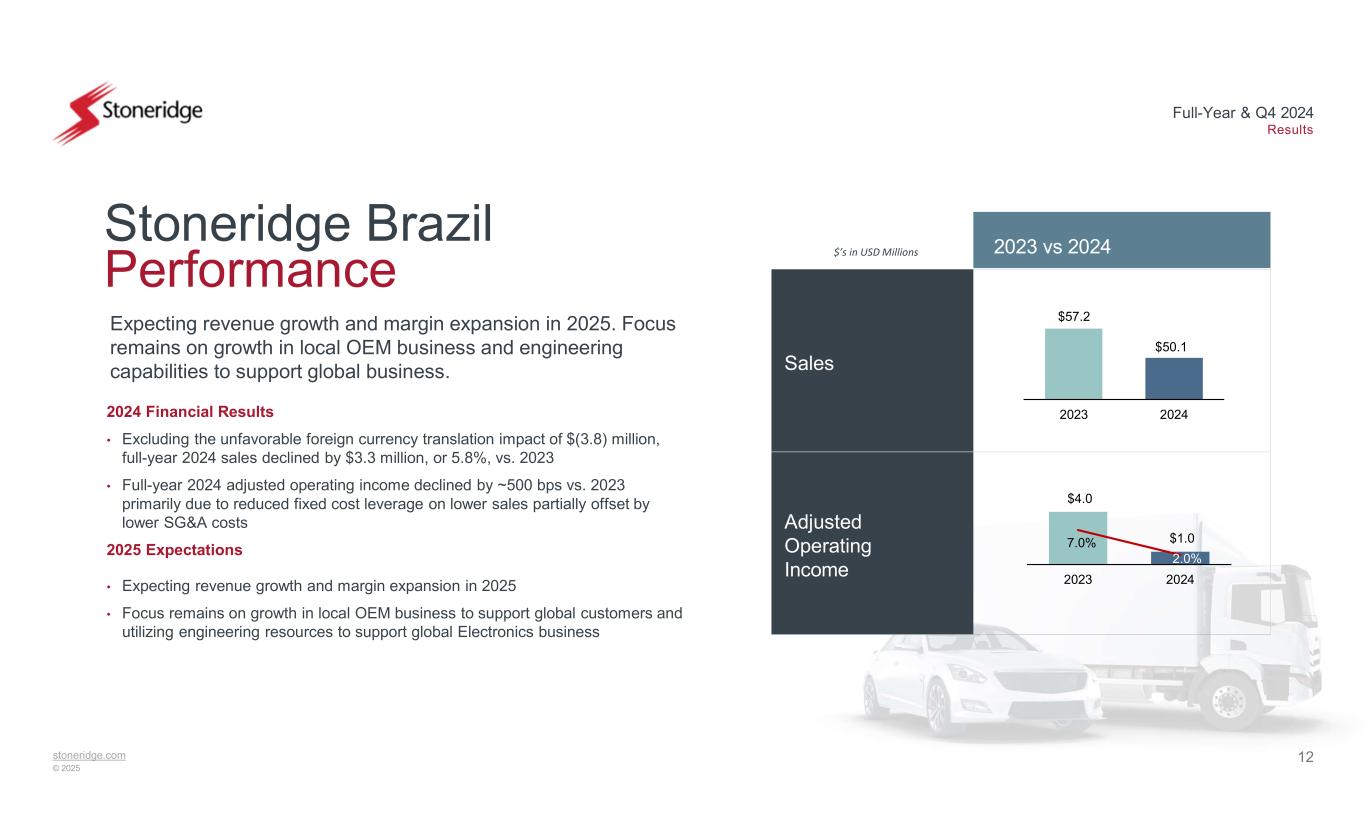 11stoneridge.com © 2025 Full-Year & Q4 2024 Results Electronics Performance 2024 Financial Results • 2024 Sales outperformed weighted-average OEM end markets by 16.3%* driven by growth in MirrorEye and SMART 2 • Material cost improved by 110 basis points vs. 2023 • Direct labor declined by 40 basis points vs. 2023 • Quality-related costs increased by $1.2m vs. 2023 – focus remains on reducing quality related costs • One-time costs related to distressed suppliers of $3.2 million incurred during 2024 2025 Expectations • Revenue growth in 2025 primarily driven by the annualization and launch of MirrorEye OEM programs, partially offset by expected end-of-life programs • Continued focus on material cost improvement activities and manufacturing efficiency • Re-designed engineering organization focused on built-in quality and rapid response / mitigation of quality related issues Expecting revenue growth and margin expansion in 2025 driven by continued growth in MirrorEye programs Sales** Adjusted Operating Income 2023 vs 2024$’s in USD Millions $593.6 $594.7 2023 2024 **2023 sales were adjusted for spot purchase recoveries. Refer to US GAAP Reconciliations for reconciliations to US GAAP amounts. $30.2 $27.9 5.1% 4.7% 2023 2024 *Weighted-average based on Electronics 2024 revenue by end markets. Source: Feb 2025 LVP IHS; Q1 2025 MHCV IHS (includes Class 5-8)