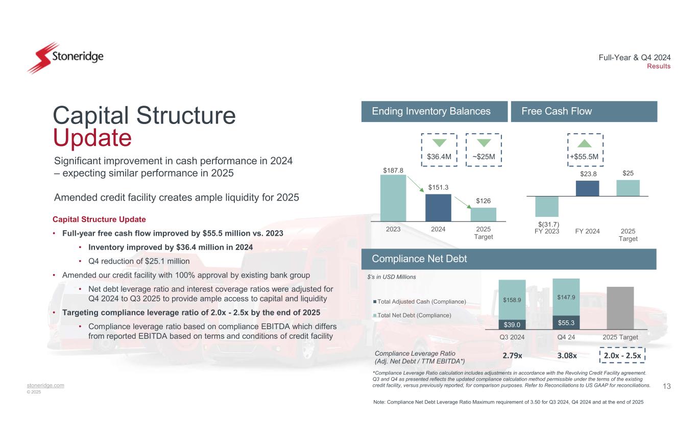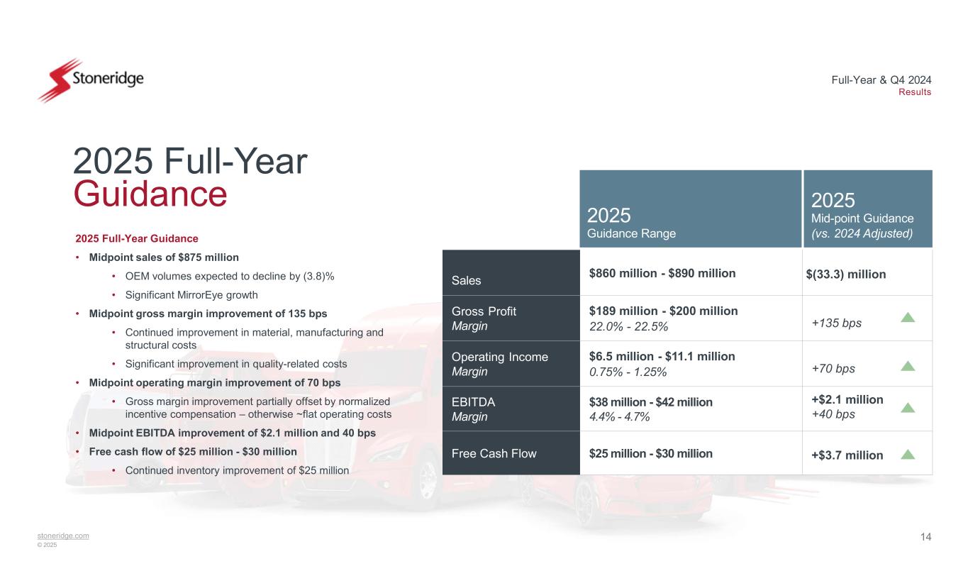 13stoneridge.com © 2025 Full-Year & Q4 2024 Results $187.8 $151.3 $126 2023 2024 2025 Target Capital Structure Update Significant improvement in cash performance in 2024 – expecting similar performance in 2025 Amended credit facility creates ample liquidity for 2025 2.0x - 2.5xCompliance Leverage Ratio (Adj. Net Debt / TTM EBITDA*) $’s in USD Millions 2.79x 3.08x Capital Structure Update • Full-year free cash flow improved by $55.5 million vs. 2023 • Inventory improved by $36.4 million in 2024 • Q4 reduction of $25.1 million • Amended our credit facility with 100% approval by existing bank group • Net debt leverage ratio and interest coverage ratios were adjusted for Q4 2024 to Q3 2025 to provide ample access to capital and liquidity • Targeting compliance leverage ratio of 2.0x - 2.5x by the end of 2025 • Compliance leverage ratio based on compliance EBITDA which differs from reported EBITDA based on terms and conditions of credit facility Compliance Net Debt Ending Inventory Balances Free Cash Flow $39.0 $55.3 $158.9 $147.9 Q3 2024 Q4 24 2025 Target Total Adjusted Cash (Compliance) Total Net Debt (Compliance) +$55.5M$36.4M ~$25M Note: Compliance Net Debt Leverage Ratio Maximum requirement of 3.50 for Q3 2024, Q4 2024 and at the end of 2025 *Compliance Leverage Ratio calculation includes adjustments in accordance with the Revolving Credit Facility agreement. Q3 and Q4 as presented reflects the updated compliance calculation method permissible under the terms of the existing credit facility, versus previously reported, for comparison purposes. Refer to Reconciliations to US GAAP for reconciliations. $(31.7) $23.8 $25 FY 2023 FY 2024 2025 Target