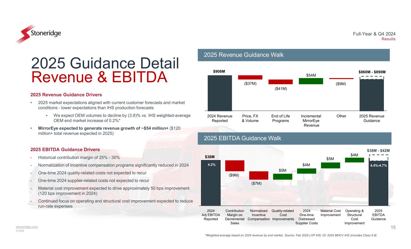 14stoneridge.com © 2025 Full-Year & Q4 2024 Results 2025 Full-Year Guidance 2025 Guidance Range 2025 Mid-point Guidance (vs. 2024 Adjusted) $(33.3) million$860 million - $890 million Sales +135 bps $189 million - $200 million 22.0% - 22.5% Gross Profit Margin +70 bps $6.5 million - $11.1 million 0.75% - 1.25% Operating Income Margin +$2.1 million +40 bps $38 million - $42 million 4.4% - 4.7% EBITDA Margin +$3.7 million$25 million - $30 millionFree Cash Flow 1 2025 Full-Year Guidance • Midpoint sales of $875 million • OEM volumes expected to decline by (3.8)% • Significant MirrorEye growth • Midpoint gross margin improvement of 135 bps • Continued improvement in material, manufacturing and structural costs • Significant improvement in quality-related costs • Midpoint operating margin improvement of 70 bps • Gross margin improvement partially offset by normalized incentive compensation – otherwise ~flat operating costs • Midpoint EBITDA improvement of $2.1 million and 40 bps • Free cash flow of $25 million - $30 million • Continued inventory improvement of $25 million
