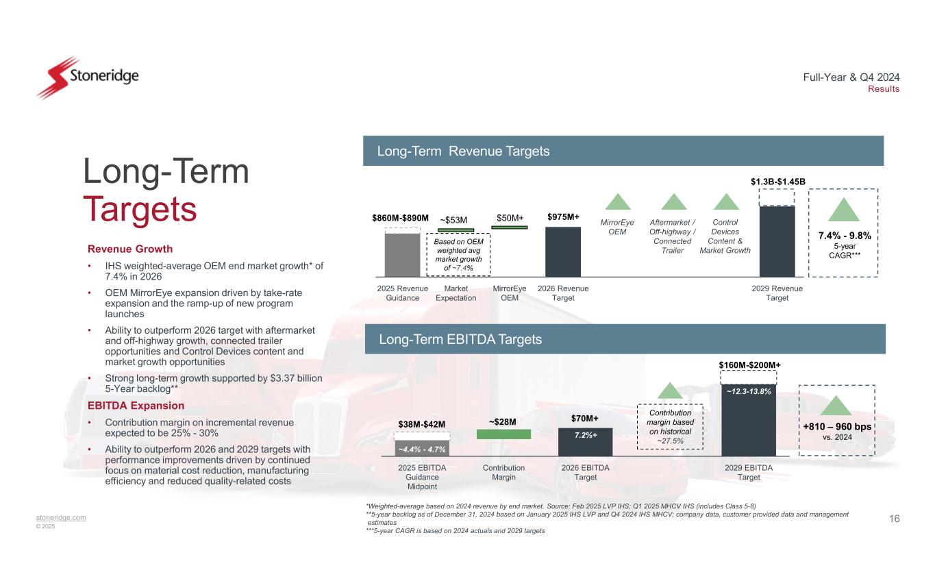 15stoneridge.com © 2025 Full-Year & Q4 2024 Results 2024 Revenue Reported Price, FX & Volume End of Life Programs Incremental MirrorEye Revenue Other 2025 Revenue Guidance 2025 Guidance Detail Revenue & EBITDA 2025 Revenue Guidance Drivers • 2025 market expectations aligned with current customer forecasts and market conditions - lower expectations than IHS production forecasts • We expect OEM volumes to decline by (3.8)% vs. IHS weighted-average OEM end market increase of 0.2%* • MirrorEye expected to generate revenue growth of ~$54 million+ ($120 million+ total revenue expected in 2025) 2025 EBITDA Guidance Drivers • Historical contribution margin of 25% - 30% • Normalization of incentive compensation programs significantly reduced in 2024 • One-time 2024 quality-related costs not expected to recur • One-time 2024 supplier-related costs not expected to recur • Material cost improvement expected to drive approximately 50 bps improvement (120 bps improvement in 2024) • Continued focus on operating and structural cost improvement expected to reduce run-rate expenses $47M - $52M 2025 Revenue Guidance Walk 2025 EBITDA Guidance Walk $38M - $42M $908M $860M - $890M ($9M) ($41M) ($37M) $54M 2024 Adj EBITDA Reported Contribution Margin on Decremental Sales Normalized Incentive Compensation Quality-related Cost Improvements 2024 One-time Distressed Supplier Costs Material Cost Improvement Operating & Structural Cost Improvement 2025 EBITDA Guidance $38M 4.2% 4.4%-4.7% ($9M) ($7M) $5M $4M $4M $5M *Weighted-average based on 2024 revenue by end market. Source: Feb 2025 LVP IHS; Q1 2025 MHCV IHS (includes Class 5-8)