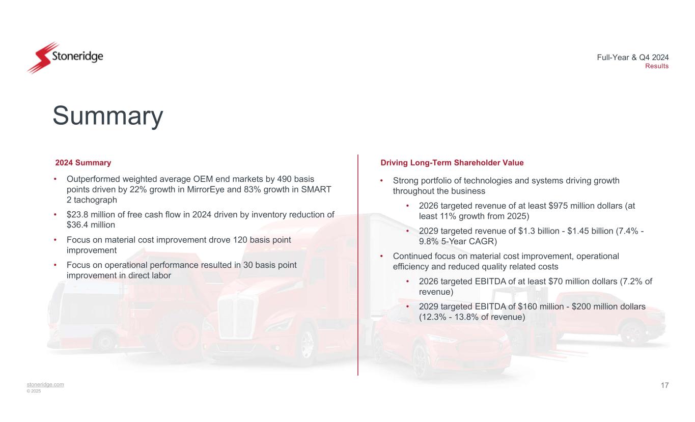 16stoneridge.com © 2025 Full-Year & Q4 2024 Results 2025 EBITDA Guidance Midpoint Contribution Margin 2026 EBITDA Target 2029 EBITDA Target 2025 Revenue Guidance Market Expectation MirrorEye OEM 2026 Revenue Target 2029 Revenue Target Long-Term EBITDA Targets Revenue Growth • IHS weighted-average OEM end market growth* of 7.4% in 2026 • OEM MirrorEye expansion driven by take-rate expansion and the ramp-up of new program launches • Ability to outperform 2026 target with aftermarket and off-highway growth, connected trailer opportunities and Control Devices content and market growth opportunities • Strong long-term growth supported by $3.37 billion 5-Year backlog** EBITDA Expansion • Contribution margin on incremental revenue expected to be 25% - 30% • Ability to outperform 2026 and 2029 targets with performance improvements driven by continued focus on material cost reduction, manufacturing efficiency and reduced quality-related costs Long-Term Targets *Weighted-average based on 2024 revenue by end market. Source: Feb 2025 LVP IHS; Q1 2025 MHCV IHS (includes Class 5-8) **5-year backlog as of December 31, 2024 based on January 2025 IHS LVP and Q4 2024 IHS MHCV; company data, customer provided data and management estimates ***5-year CAGR is based on 2024 actuals and 2029 targets Long-Term Revenue Targets Based on OEM weighted avg market growth of ~7.4% $860M-$890M $975M+ $1.3B-$1.45B 7.4% - 9.8% 5-year CAGR*** +810 – 960 bps vs. 2024 MirrorEye OEM Aftermarket / Off-highway / Connected Trailer Control Devices Content & Market Growth ~12.3-13.8% ~7.2% $38M-$42M $70M+ $160M-$200M+ ~4.4% - 4.7% Contribution margin based on historical ~27.5% ~$53M $50M+ ~$28M 7.2%+