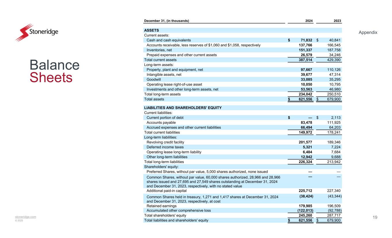 stoneridge.com © 2025 Appendix 19 Balance Sheets 20232024December 31, (in thousands) ASSETS Current assets: $ 40,841$ 71,832Cash and cash equivalents 166,545137,766Accounts receivable, less reserves of $1,060 and $1,058, respectively 187,758151,337Inventories, net 34,24626,579Prepaid expenses and other current assets 429,390387,514Total current assets Long-term assets: 110,12697,667Property, plant and equipment, net 47,31439,677Intangible assets, net 35,29533,085Goodwill 10,79510,050Operating lease right-of-use asset 46,98053,563Investments and other long-term assets, net 250,510234,042Total long-term assets $ 679,900$ 621,556Total assets LIABILITIES AND SHAREHOLDERS' EQUITY Current liabilities: $ 2,113$ —Current portion of debt 111,92583,478Accounts payable 64,20366,494Accrued expenses and other current liabilities 178,241149,972Total current liabilities Long-term liabilities: 189,346201,577Revolving credit facility 7,2245,321Deferred income taxes 7,6846,484Operating lease long-term liability 9,68812,942Other long-term liabilities 213,942226,324Total long-term liabilities Shareholders' equity: ——Preferred Shares, without par value, 5,000 shares authorized, none issued ——Common Shares, without par value, 60,000 shares authorized, 28,966 and 28,966 shares issued and 27,695 and 27,549 shares outstanding at December 31, 2024 and December 31, 2023, respectively, with no stated value 227,340225,712Additional paid-in capital (43,344)(38,424)Common Shares held in treasury, 1,271 and 1,417 shares at December 31, 2024 and December 31, 2023, respectively, at cost 196,509179,985Retained earnings (92,788)(122,013)Accumulated other comprehensive loss 287,717245,260Total shareholders' equity $ 679,900$ 621,556Total liabilities and shareholders' equity