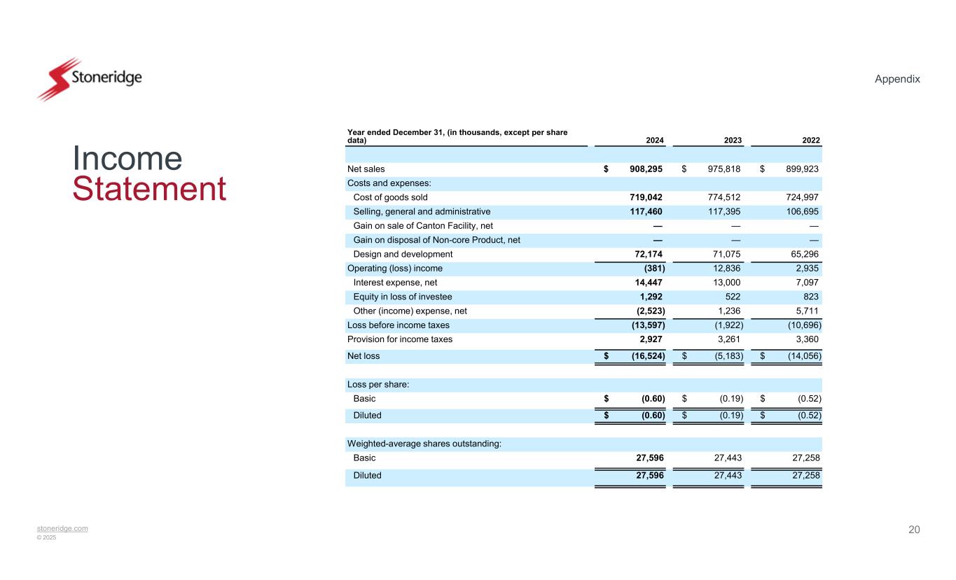 stoneridge.com © 2025 Appendix 20 Income Statement 202220232024 Year ended December 31, (in thousands, except per share data) $ 899,923$ 975,818$ 908,295Net sales Costs and expenses: 724,997774,512719,042Cost of goods sold 106,695117,395117,460Selling, general and administrative ———Gain on sale of Canton Facility, net ———Gain on disposal of Non-core Product, net 65,29671,07572,174Design and development 2,93512,836(381)Operating (loss) income 7,09713,00014,447Interest expense, net 8235221,292Equity in loss of investee 5,7111,236(2,523)Other (income) expense, net (10,696)(1,922)(13,597)Loss before income taxes 3,3603,2612,927Provision for income taxes $ (14,056)$ (5,183)$ (16,524)Net loss Loss per share: $ (0.52)$ (0.19)$ (0.60)Basic $ (0.52)$ (0.19)$ (0.60)Diluted Weighted-average shares outstanding: 27,25827,44327,596Basic 27,25827,44327,596Diluted