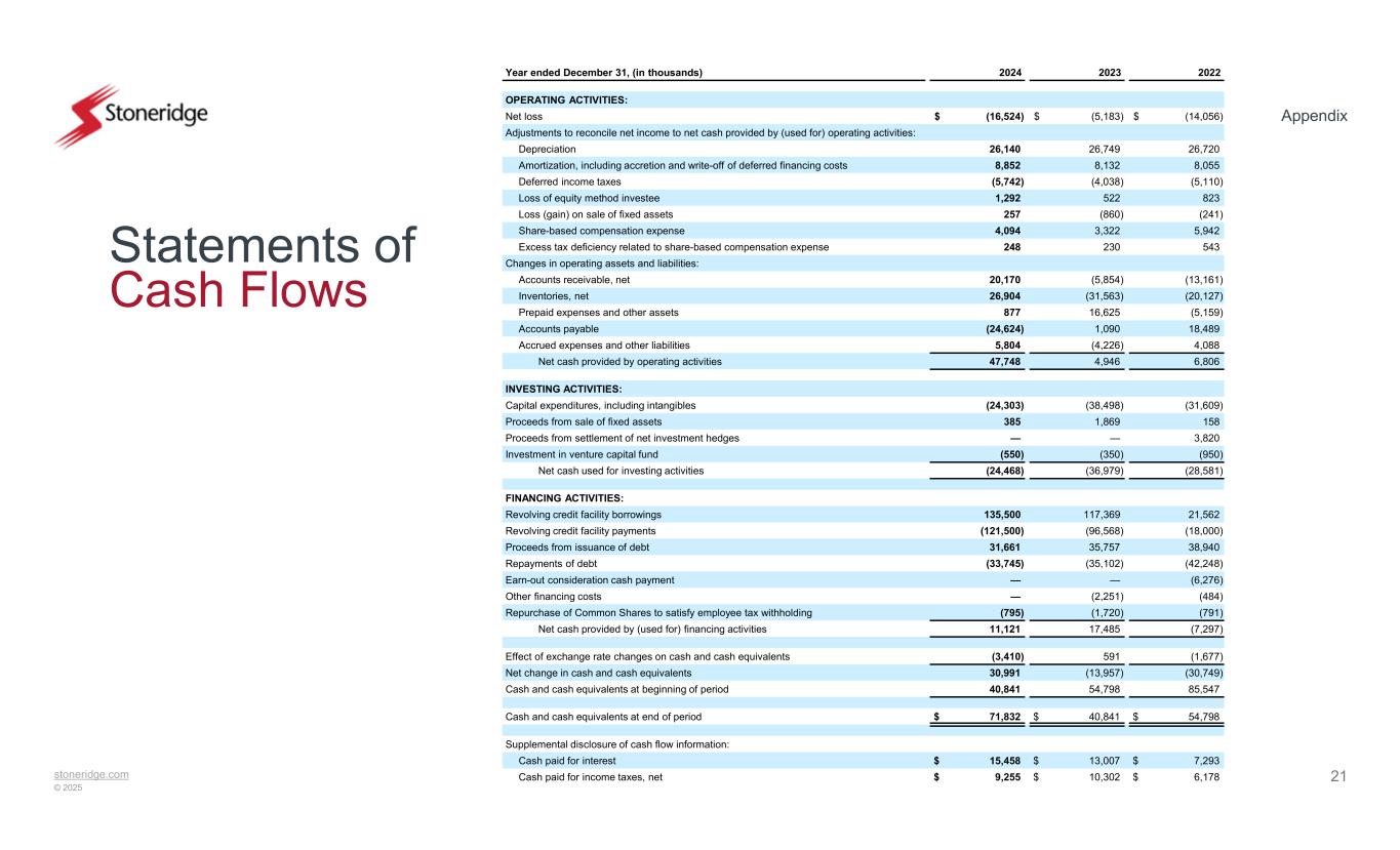 stoneridge.com © 2025 Appendix 21 Statements of Cash Flows 202220232024Year ended December 31, (in thousands) OPERATING ACTIVITIES: $ (14,056)$ (5,183)$ (16,524)Net loss Adjustments to reconcile net income to net cash provided by (used for) operating activities: 26,72026,74926,140Depreciation 8,0558,1328,852Amortization, including accretion and write-off of deferred financing costs (5,110)(4,038)(5,742)Deferred income taxes 8235221,292Loss of equity method investee (241)(860)257Loss (gain) on sale of fixed assets 5,9423,3224,094Share-based compensation expense 543230248Excess tax deficiency related to share-based compensation expense Changes in operating assets and liabilities: (13,161)(5,854)20,170Accounts receivable, net (20,127)(31,563)26,904Inventories, net (5,159)16,625877Prepaid expenses and other assets 18,4891,090(24,624)Accounts payable 4,088(4,226)5,804Accrued expenses and other liabilities 6,8064,94647,748Net cash provided by operating activities INVESTING ACTIVITIES: (31,609)(38,498)(24,303)Capital expenditures, including intangibles 1581,869385Proceeds from sale of fixed assets 3,820——Proceeds from settlement of net investment hedges (950)(350)(550)Investment in venture capital fund (28,581)(36,979)(24,468)Net cash used for investing activities FINANCING ACTIVITIES: 21,562117,369135,500Revolving credit facility borrowings (18,000)(96,568)(121,500)Revolving credit facility payments 38,94035,75731,661Proceeds from issuance of debt (42,248)(35,102)(33,745)Repayments of debt (6,276)——Earn-out consideration cash payment (484)(2,251)—Other financing costs (791)(1,720)(795)Repurchase of Common Shares to satisfy employee tax withholding (7,297)17,48511,121Net cash provided by (used for) financing activities (1,677)591(3,410)Effect of exchange rate changes on cash and cash equivalents (30,749)(13,957)30,991Net change in cash and cash equivalents 85,54754,79840,841Cash and cash equivalents at beginning of period $ 54,798$ 40,841$ 71,832Cash and cash equivalents at end of period Supplemental disclosure of cash flow information: $ 7,293$ 13,007$ 15,458Cash paid for interest $ 6,178$ 10,302$ 9,255Cash paid for income taxes, net
