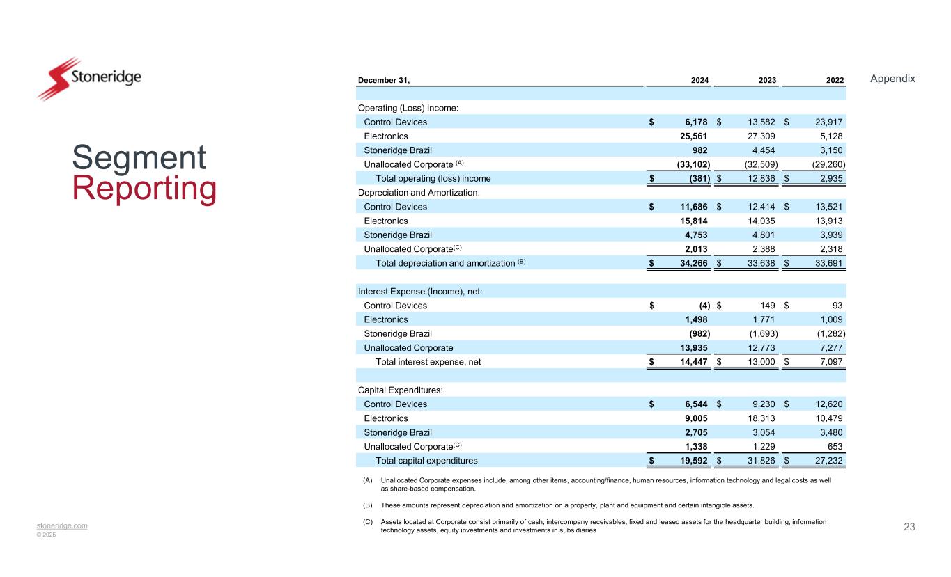 stoneridge.com © 2025 Appendix 23 Segment Reporting 202220232024December 31, Operating (Loss) Income: $ 23,917$ 13,582$ 6,178Control Devices 5,12827,30925,561Electronics 3,1504,454982Stoneridge Brazil (29,260)(32,509)(33,102)Unallocated Corporate (A) $ 2,935$ 12,836$ (381)Total operating (loss) income Depreciation and Amortization: $ 13,521$ 12,414$ 11,686Control Devices 13,91314,03515,814Electronics 3,9394,8014,753Stoneridge Brazil 2,3182,3882,013Unallocated Corporate(C) $ 33,691$ 33,638$ 34,266Total depreciation and amortization (B) Interest Expense (Income), net: $ 93$ 149$ (4)Control Devices 1,0091,7711,498Electronics (1,282)(1,693)(982)Stoneridge Brazil 7,27712,77313,935Unallocated Corporate $ 7,097$ 13,000$ 14,447Total interest expense, net Capital Expenditures: $ 12,620$ 9,230$ 6,544Control Devices 10,47918,3139,005Electronics 3,4803,0542,705Stoneridge Brazil 6531,2291,338Unallocated Corporate(C) $ 27,232$ 31,826$ 19,592Total capital expenditures (A) Unallocated Corporate expenses include, among other items, accounting/finance, human resources, information technology and legal costs as well as share-based compensation. (B) These amounts represent depreciation and amortization on a property, plant and equipment and certain intangible assets. (C) Assets located at Corporate consist primarily of cash, intercompany receivables, fixed and leased assets for the headquarter building, information technology assets, equity investments and investments in subsidiaries