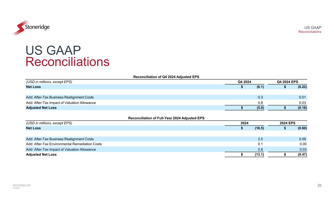 stoneridge.com © 2025 US GAAP Reconciliations US GAAP Reconciliations 25 This document contains information about Stoneridge's financial results which is not presented in accordance with accounting principles generally accepted in the United States ("GAAP"). Such non-GAAP financial measures are reconciled to their closest GAAP financial measures in the appendix of this document. The provision of these non-GAAP financial measures is not intended to indicate that Stoneridge is explicitly or implicitly providing projections on those non- GAAP financial measures, and actual results for such measures are likely to vary from those presented. The reconciliations include all information reasonably available to the Company at the date of this document and the adjustments that management can reasonably predict.