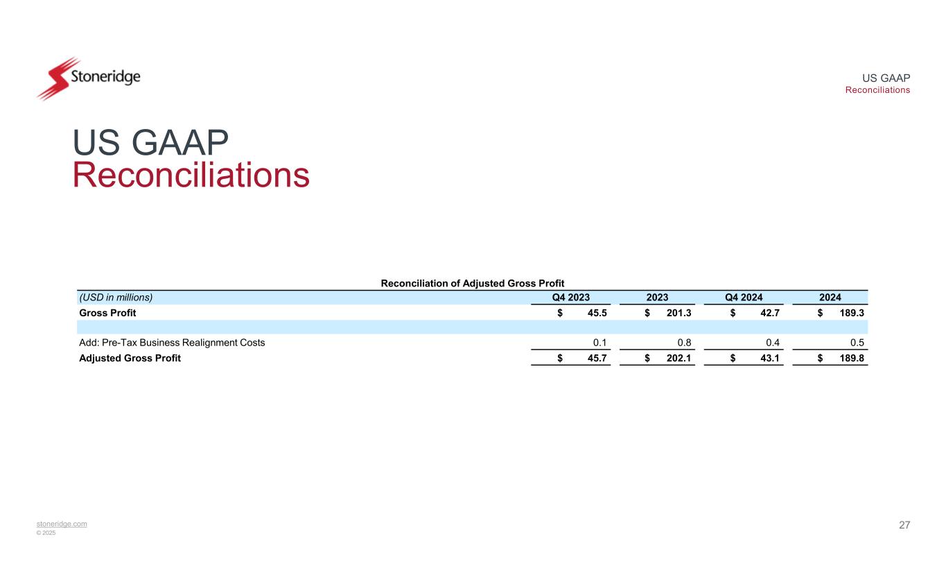 stoneridge.com © 2025 US GAAP Reconciliations 26 US GAAP Reconciliations Reconciliation of Full-Year 2024 Adjusted EPS 2024 EPS2024(USD in millions, except EPS) $ (0.60)$ (16.5)Net Loss 0.092.5Add: After-Tax Business Realignment Costs 0.000.1Add: After-Tax Environmental Remediation Costs 0.030.8Add: After-Tax Impact of Valuation Allowance $ (0.47)$ (13.1)Adjusted Net Loss Reconciliation of Q4 2024 Adjusted EPS Q4 2024 EPSQ4 2024(USD in millions, except EPS) $ (0.22)$ (6.1)Net Loss 0.010.3Add: After-Tax Business Realignment Costs 0.030.8Add: After-Tax Impact of Valuation Allowance $ (0.18)$ (5.0)Adjusted Net Loss