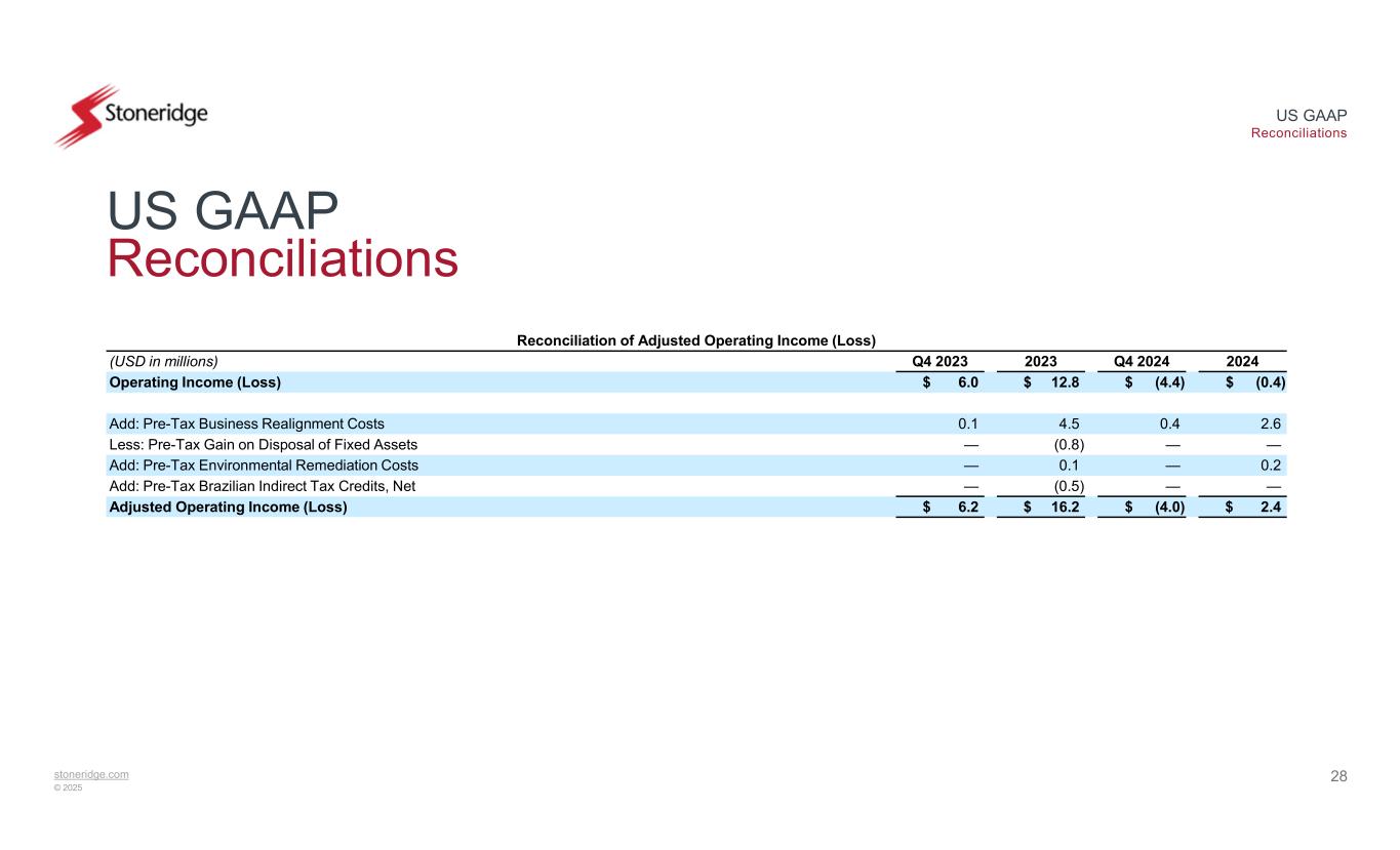 stoneridge.com © 2025 US GAAP Reconciliations 27 US GAAP Reconciliations Reconciliation of Adjusted Gross Profit 2024Q4 20242023Q4 2023(USD in millions) $ 189.3$ 42.7$ 201.3$ 45.5Gross Profit 0.50.40.80.1Add: Pre-Tax Business Realignment Costs $ 189.8$ 43.1$ 202.1$ 45.7Adjusted Gross Profit