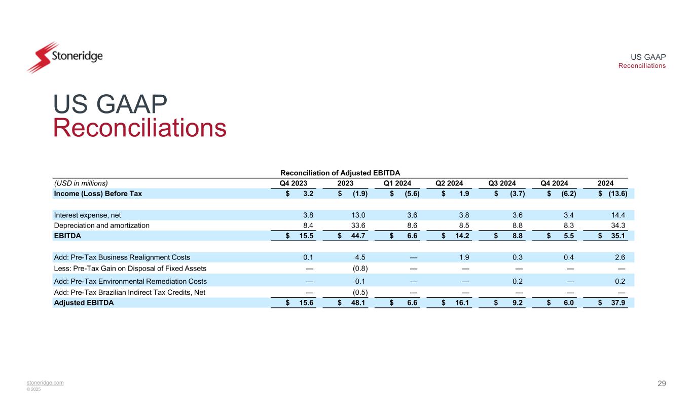 stoneridge.com © 2025 US GAAP Reconciliations 28 US GAAP Reconciliations Reconciliation of Adjusted Operating Income (Loss) 2024Q4 20242023Q4 2023(USD in millions) $ (0.4)$ (4.4)$ 12.8$ 6.0Operating Income (Loss) 2.60.44.50.1Add: Pre-Tax Business Realignment Costs ——(0.8)—Less: Pre-Tax Gain on Disposal of Fixed Assets 0.2—0.1—Add: Pre-Tax Environmental Remediation Costs ——(0.5)—Add: Pre-Tax Brazilian Indirect Tax Credits, Net $ 2.4$ (4.0)$ 16.2$ 6.2Adjusted Operating Income (Loss)