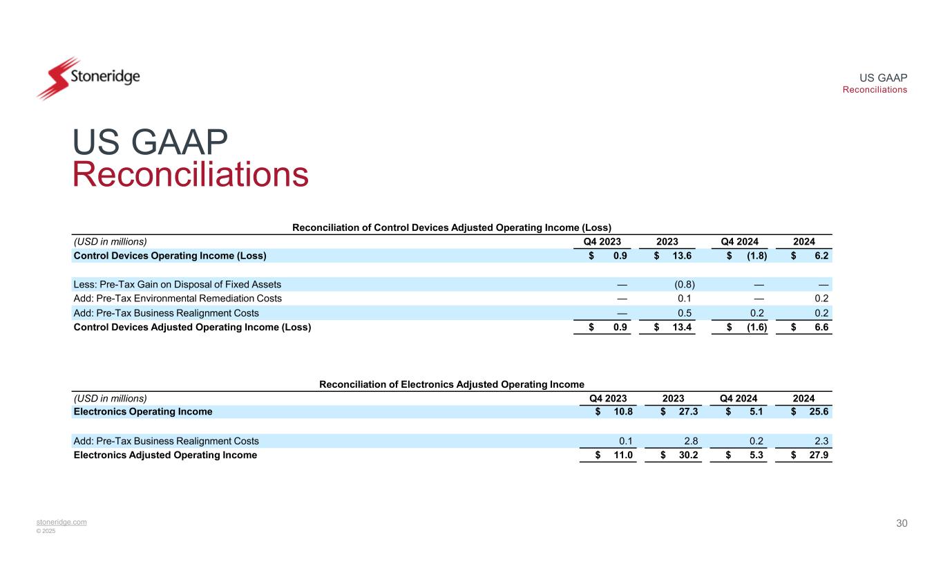 stoneridge.com © 2025 US GAAP Reconciliations 29 US GAAP Reconciliations Reconciliation of Adjusted EBITDA 2024Q4 2024Q3 2024Q2 2024Q1 20242023Q4 2023(USD in millions) $ (13.6)$ (6.2)$ (3.7)$ 1.9$ (5.6)$ (1.9)$ 3.2Income (Loss) Before Tax 14.43.43.63.83.613.03.8Interest expense, net 34.38.38.88.58.633.68.4Depreciation and amortization $ 35.1$ 5.5$ 8.8$ 14.2$ 6.6$ 44.7$ 15.5EBITDA 2.60.40.31.9—4.50.1Add: Pre-Tax Business Realignment Costs —————(0.8)—Less: Pre-Tax Gain on Disposal of Fixed Assets 0.2—0.2——0.1—Add: Pre-Tax Environmental Remediation Costs —————(0.5)—Add: Pre-Tax Brazilian Indirect Tax Credits, Net $ 37.9$ 6.0$ 9.2$ 16.1$ 6.6$ 48.1$ 15.6Adjusted EBITDA