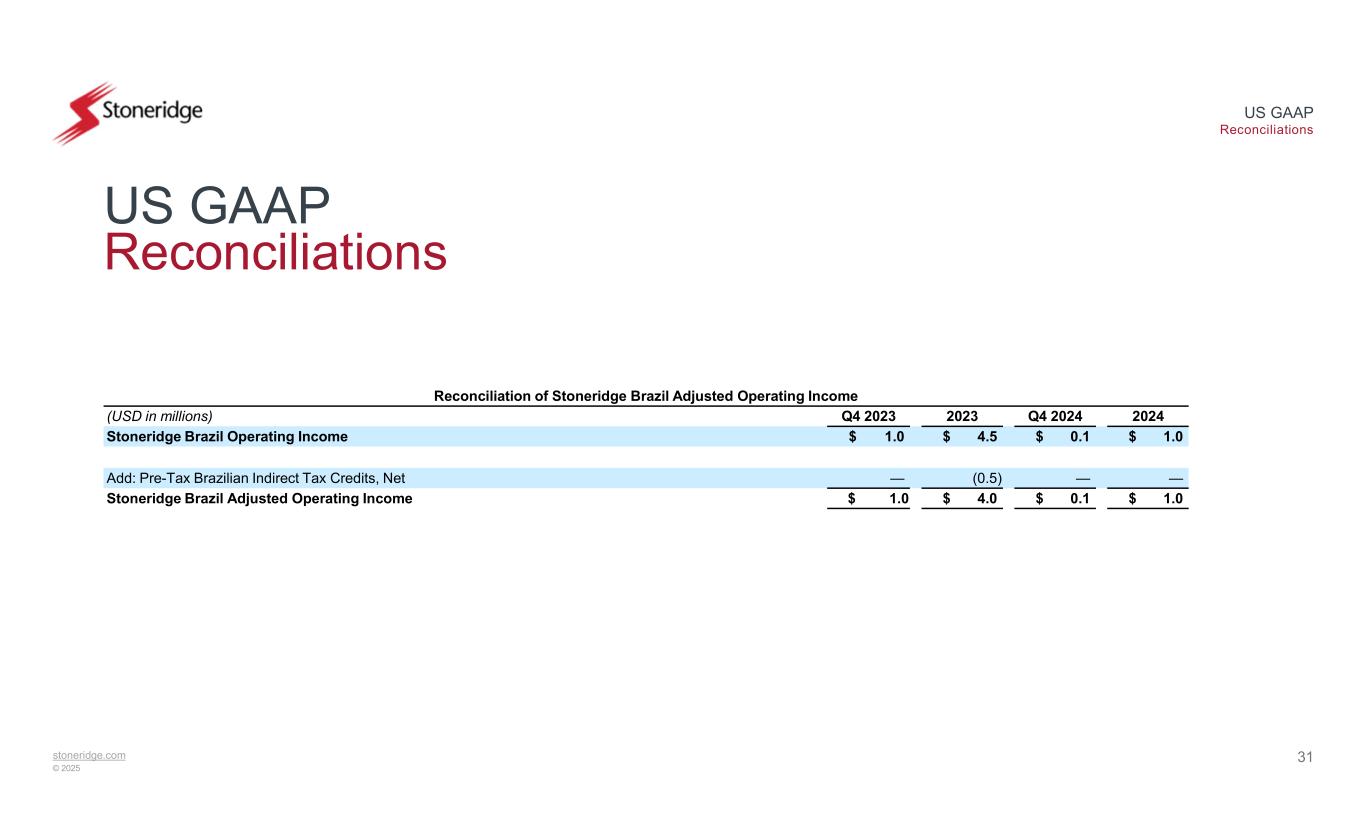 stoneridge.com © 2025 US GAAP Reconciliations 30 US GAAP Reconciliations Reconciliation of Electronics Adjusted Operating Income 2024Q4 20242023Q4 2023(USD in millions) $ 25.6$ 5.1$ 27.3$ 10.8Electronics Operating Income 2.30.22.80.1Add: Pre-Tax Business Realignment Costs $ 27.9$ 5.3$ 30.2$ 11.0Electronics Adjusted Operating Income Reconciliation of Control Devices Adjusted Operating Income (Loss) 2024Q4 20242023Q4 2023(USD in millions) $ 6.2$ (1.8)$ 13.6$ 0.9Control Devices Operating Income (Loss) ——(0.8)—Less: Pre-Tax Gain on Disposal of Fixed Assets 0.2—0.1—Add: Pre-Tax Environmental Remediation Costs 0.20.20.5—Add: Pre-Tax Business Realignment Costs $ 6.6$ (1.6)$ 13.4$ 0.9Control Devices Adjusted Operating Income (Loss)