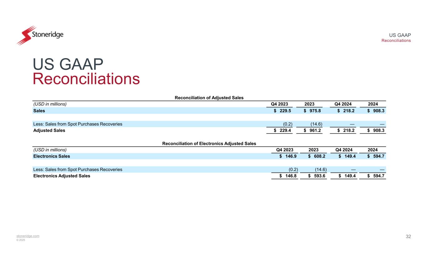 stoneridge.com © 2025 US GAAP Reconciliations 31 US GAAP Reconciliations Reconciliation of Stoneridge Brazil Adjusted Operating Income 2024Q4 20242023Q4 2023(USD in millions) $ 1.0$ 0.1$ 4.5$ 1.0Stoneridge Brazil Operating Income ——(0.5)—Add: Pre-Tax Brazilian Indirect Tax Credits, Net $ 1.0$ 0.1$ 4.0$ 1.0Stoneridge Brazil Adjusted Operating Income