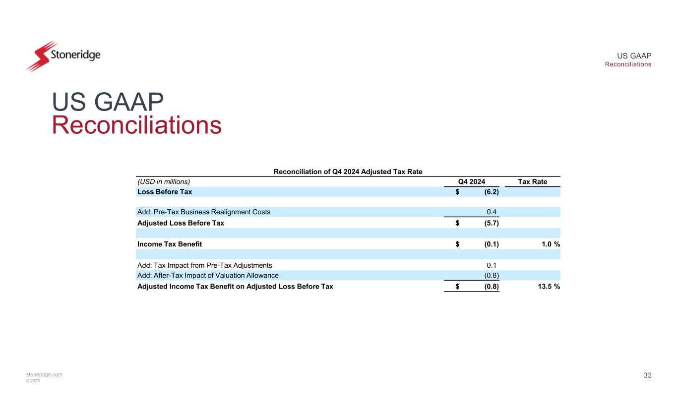 stoneridge.com © 2025 US GAAP Reconciliations 32 US GAAP Reconciliations Reconciliation of Adjusted Sales 2024Q4 20242023Q4 2023(USD in millions) $ 908.3$ 218.2$ 975.8$ 229.5Sales ——(14.6)(0.2)Less: Sales from Spot Purchases Recoveries $ 908.3$ 218.2$ 961.2$ 229.4Adjusted Sales Reconciliation of Electronics Adjusted Sales 2024Q4 20242023Q4 2023(USD in millions) $ 594.7$ 149.4$ 608.2$ 146.9Electronics Sales ——(14.6)(0.2)Less: Sales from Spot Purchases Recoveries $ 594.7$ 149.4$ 593.6$ 146.8Electronics Adjusted Sales