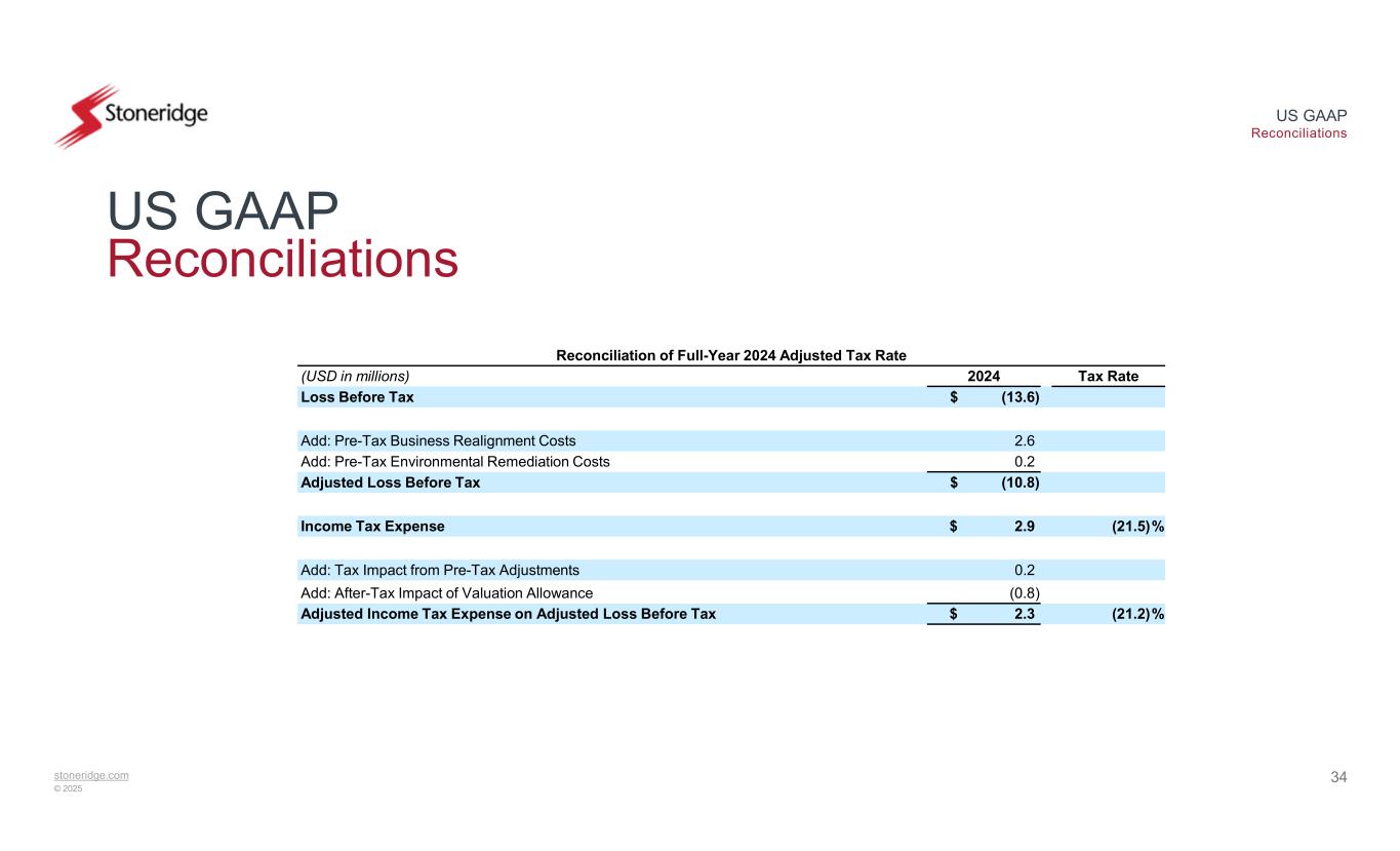 stoneridge.com © 2025 US GAAP Reconciliations 33 US GAAP Reconciliations Reconciliation of Q4 2024 Adjusted Tax Rate Tax RateQ4 2024(USD in millions) $ (6.2)Loss Before Tax 0.4Add: Pre-Tax Business Realignment Costs $ (5.7)Adjusted Loss Before Tax 1.0 %$ (0.1)Income Tax Benefit 0.1Add: Tax Impact from Pre-Tax Adjustments (0.8)Add: After-Tax Impact of Valuation Allowance 13.5 %$ (0.8)Adjusted Income Tax Benefit on Adjusted Loss Before Tax