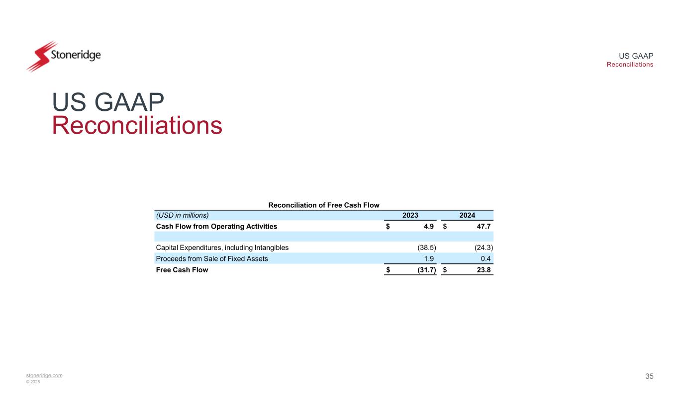stoneridge.com © 2025 US GAAP Reconciliations 34 US GAAP Reconciliations Reconciliation of Full-Year 2024 Adjusted Tax Rate Tax Rate2024(USD in millions) $ (13.6)Loss Before Tax 2.6Add: Pre-Tax Business Realignment Costs 0.2Add: Pre-Tax Environmental Remediation Costs $ (10.8)Adjusted Loss Before Tax (21.5)%$ 2.9Income Tax Expense 0.2Add: Tax Impact from Pre-Tax Adjustments (0.8)Add: After-Tax Impact of Valuation Allowance (21.2)%$ 2.3Adjusted Income Tax Expense on Adjusted Loss Before Tax