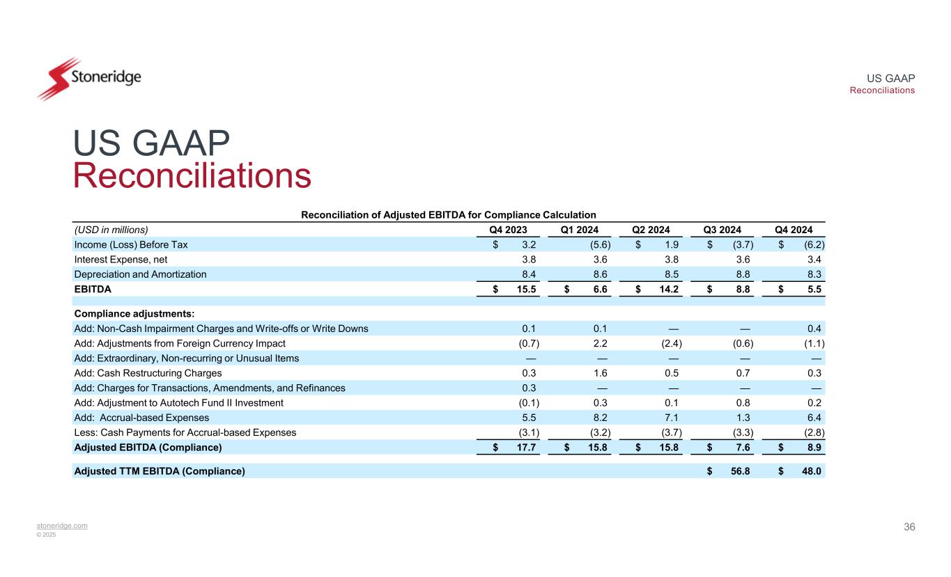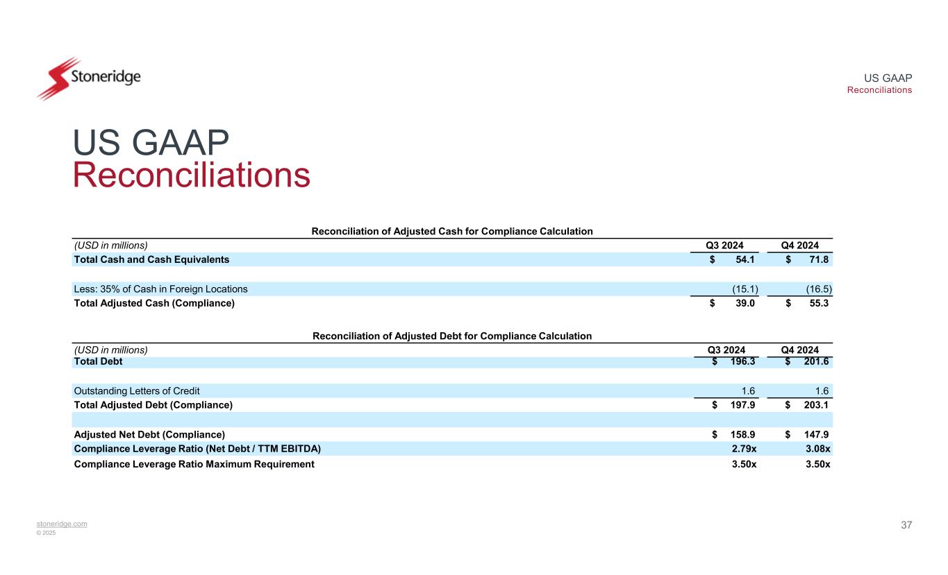 stoneridge.com © 2025 US GAAP Reconciliations 36 US GAAP Reconciliations Reconciliation of Adjusted EBITDA for Compliance Calculation Q4 2024Q3 2024Q2 2024Q1 2024Q4 2023(USD in millions) $ (6.2)$ (3.7)$ 1.9(5.6)$ 3.2Income (Loss) Before Tax 3.43.63.83.63.8Interest Expense, net 8.38.88.58.68.4Depreciation and Amortization $ 5.5$ 8.8$ 14.2$ 6.6$ 15.5EBITDA Compliance adjustments: 0.4——0.10.1Add: Non-Cash Impairment Charges and Write-offs or Write Downs (1.1)(0.6)(2.4)2.2(0.7)Add: Adjustments from Foreign Currency Impact —————Add: Extraordinary, Non-recurring or Unusual Items 0.30.70.51.60.3Add: Cash Restructuring Charges ————0.3Add: Charges for Transactions, Amendments, and Refinances 0.20.80.10.3(0.1)Add: Adjustment to Autotech Fund II Investment 6.41.37.18.25.5Add: Accrual-based Expenses (2.8)(3.3)(3.7)(3.2)(3.1)Less: Cash Payments for Accrual-based Expenses $ 8.9$ 7.6$ 15.8$ 15.8$ 17.7Adjusted EBITDA (Compliance) $ 48.0$ 56.8Adjusted TTM EBITDA (Compliance)