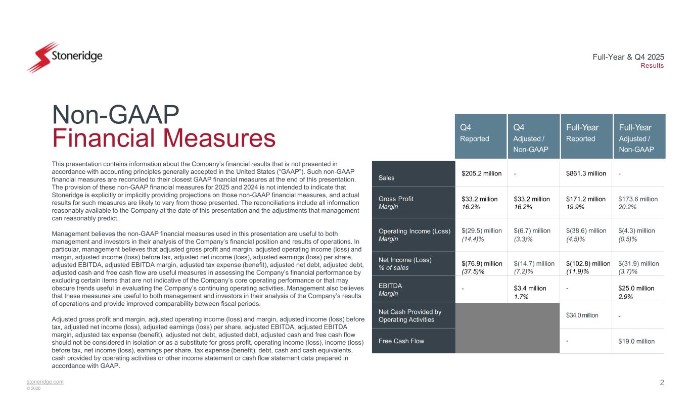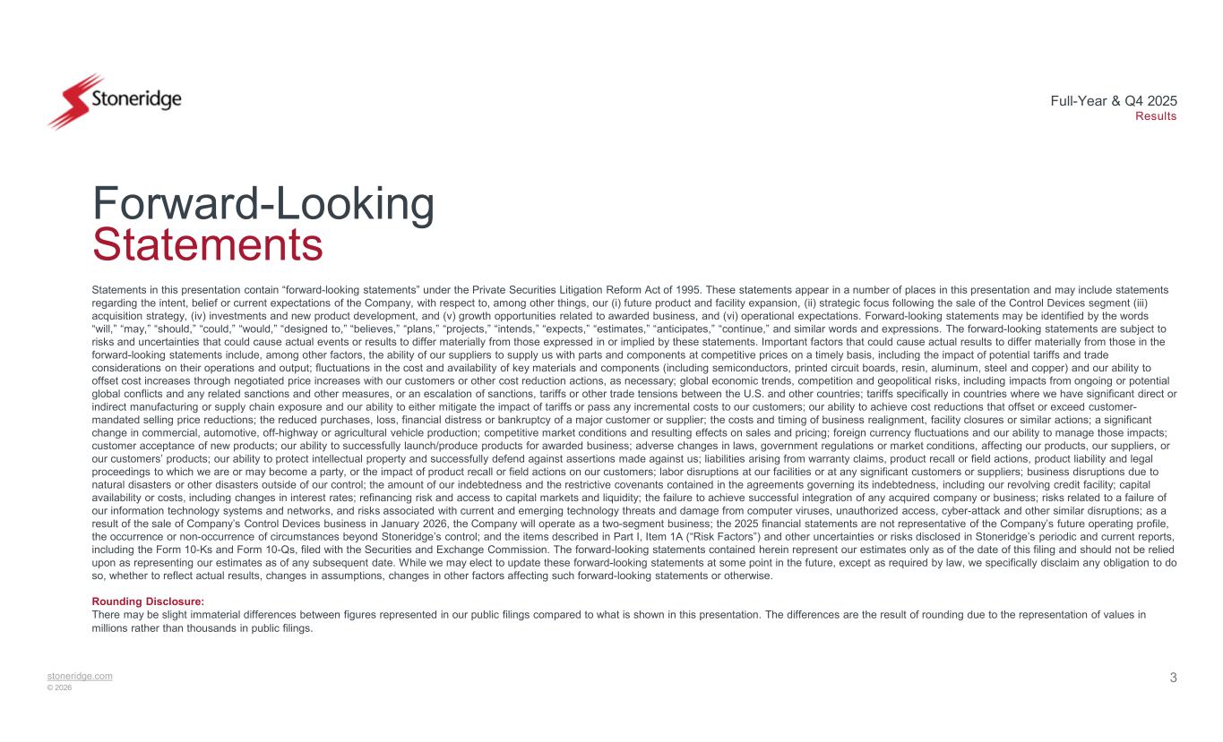 stoneridge.com © 2026 Full-Year & Q4 2025 Results 2 Non-GAAP Financial Measures This presentation contains information about the Company’s financial results that is not presented in accordance with accounting principles generally accepted in the United States (“GAAP”). Such non-GAAP financial measures are reconciled to their closest GAAP financial measures at the end of this presentation. The provision of these non-GAAP financial measures for 2025 and 2024 is not intended to indicate that Stoneridge is explicitly or implicitly providing projections on those non-GAAP financial measures, and actual results for such measures are likely to vary from those presented. The reconciliations include all information reasonably available to the Company at the date of this presentation and the adjustments that management can reasonably predict. Management believes the non-GAAP financial measures used in this presentation are useful to both management and investors in their analysis of the Company’s financial position and results of operations. In particular, management believes that adjusted gross profit and margin, adjusted operating income (loss) and margin, adjusted income (loss) before tax, adjusted net income (loss), adjusted earnings (loss) per share, adjusted EBITDA, adjusted EBITDA margin, adjusted tax expense (benefit), adjusted net debt, adjusted debt, adjusted cash and free cash flow are useful measures in assessing the Company’s financial performance by excluding certain items that are not indicative of the Company’s core operating performance or that may obscure trends useful in evaluating the Company’s continuing operating activities. Management also believes that these measures are useful to both management and investors in their analysis of the Company’s results of operations and provide improved comparability between fiscal periods. Adjusted gross profit and margin, adjusted operating income (loss) and margin, adjusted income (loss) before tax, adjusted net income (loss), adjusted earnings (loss) per share, adjusted EBITDA, adjusted EBITDA margin, adjusted tax expense (benefit), adjusted net debt, adjusted debt, adjusted cash and free cash flow should not be considered in isolation or as a substitute for gross profit, operating income (loss), income (loss) before tax, net income (loss), earnings per share, tax expense (benefit), debt, cash and cash equivalents, cash provided by operating activities or other income statement or cash flow statement data prepared in accordance with GAAP. Q4 Reported Q4 Adjusted / Non-GAAP Full-Year Reported Full-Year Adjusted / Non-GAAP -$861.3 million-$205.2 million Sales $173.6 million 20.2% $171.2 million 19.9% $33.2 million 16.2% $33.2 million 16.2% Gross Profit Margin $(4.3) million (0.5)% $(38.6) million (4.5)% $(6.7) million (3.3)% $(29.5) million (14.4)% Operating Income (Loss) Margin $(31.9) million (3.7)% $(102.8) million (11.9)% $(14.7) million (7.2)% $(76.9) million (37.5)% Net Income (Loss) % of sales $25.0 million 2.9% -$3.4 million 1.7% -EBITDA Margin -$34.0 millionNet Cash Provided by Operating Activities $19.0 million-Free Cash Flow