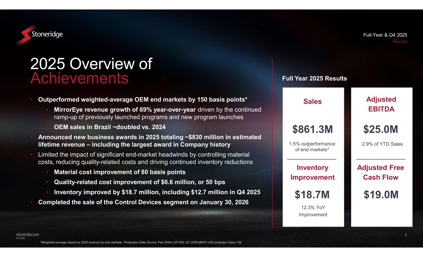 stoneridge.com © 2026 Full-Year & Q4 2025 Results 3 Forward-Looking Statements Statements in this presentation contain “forward-looking statements” under the Private Securities Litigation Reform Act of 1995. These statements appear in a number of places in this presentation and may include statements regarding the intent, belief or current expectations of the Company, with respect to, among other things, our (i) future product and facility expansion, (ii) strategic focus following the sale of the Control Devices segment (iii) acquisition strategy, (iv) investments and new product development, and (v) growth opportunities related to awarded business, and (vi) operational expectations. Forward-looking statements may be identified by the words “will,” “may,” “should,” “could,” “would,” “designed to,” “believes,” “plans,” “projects,” “intends,” “expects,” “estimates,” “anticipates,” “continue,” and similar words and expressions. The forward-looking statements are subject to risks and uncertainties that could cause actual events or results to differ materially from those expressed in or implied by these statements. Important factors that could cause actual results to differ materially from those in the forward-looking statements include, among other factors, the ability of our suppliers to supply us with parts and components at competitive prices on a timely basis, including the impact of potential tariffs and trade considerations on their operations and output; fluctuations in the cost and availability of key materials and components (including semiconductors, printed circuit boards, resin, aluminum, steel and copper) and our ability to offset cost increases through negotiated price increases with our customers or other cost reduction actions, as necessary; global economic trends, competition and geopolitical risks, including impacts from ongoing or potential global conflicts and any related sanctions and other measures, or an escalation of sanctions, tariffs or other trade tensions between the U.S. and other countries; tariffs specifically in countries where we have significant direct or indirect manufacturing or supply chain exposure and our ability to either mitigate the impact of tariffs or pass any incremental costs to our customers; our ability to achieve cost reductions that offset or exceed customer- mandated selling price reductions; the reduced purchases, loss, financial distress or bankruptcy of a major customer or supplier; the costs and timing of business realignment, facility closures or similar actions; a significant change in commercial, automotive, off-highway or agricultural vehicle production; competitive market conditions and resulting effects on sales and pricing; foreign currency fluctuations and our ability to manage those impacts; customer acceptance of new products; our ability to successfully launch/produce products for awarded business; adverse changes in laws, government regulations or market conditions, affecting our products, our suppliers, or our customers’ products; our ability to protect intellectual property and successfully defend against assertions made against us; liabilities arising from warranty claims, product recall or field actions, product liability and legal proceedings to which we are or may become a party, or the impact of product recall or field actions on our customers; labor disruptions at our facilities or at any significant customers or suppliers; business disruptions due to natural disasters or other disasters outside of our control; the amount of our indebtedness and the restrictive covenants contained in the agreements governing its indebtedness, including our revolving credit facility; capital availability or costs, including changes in interest rates; refinancing risk and access to capital markets and liquidity; the failure to achieve successful integration of any acquired company or business; risks related to a failure of our information technology systems and networks, and risks associated with current and emerging technology threats and damage from computer viruses, unauthorized access, cyber-attack and other similar disruptions; as a result of the sale of Company’s Control Devices business in January 2026, the Company will operate as a two-segment business; the 2025 financial statements are not representative of the Company’s future operating profile, the occurrence or non-occurrence of circumstances beyond Stoneridge’s control; and the items described in Part I, Item 1A (“Risk Factors”) and other uncertainties or risks disclosed in Stoneridge’s periodic and current reports, including the Form 10-Ks and Form 10-Qs, filed with the Securities and Exchange Commission. The forward-looking statements contained herein represent our estimates only as of the date of this filing and should not be relied upon as representing our estimates as of any subsequent date. While we may elect to update these forward-looking statements at some point in the future, except as required by law, we specifically disclaim any obligation to do so, whether to reflect actual results, changes in assumptions, changes in other factors affecting such forward-looking statements or otherwise. Rounding Disclosure: There may be slight immaterial differences between figures represented in our public filings compared to what is shown in this presentation. The differences are the result of rounding due to the representation of values in millions rather than thousands in public filings.