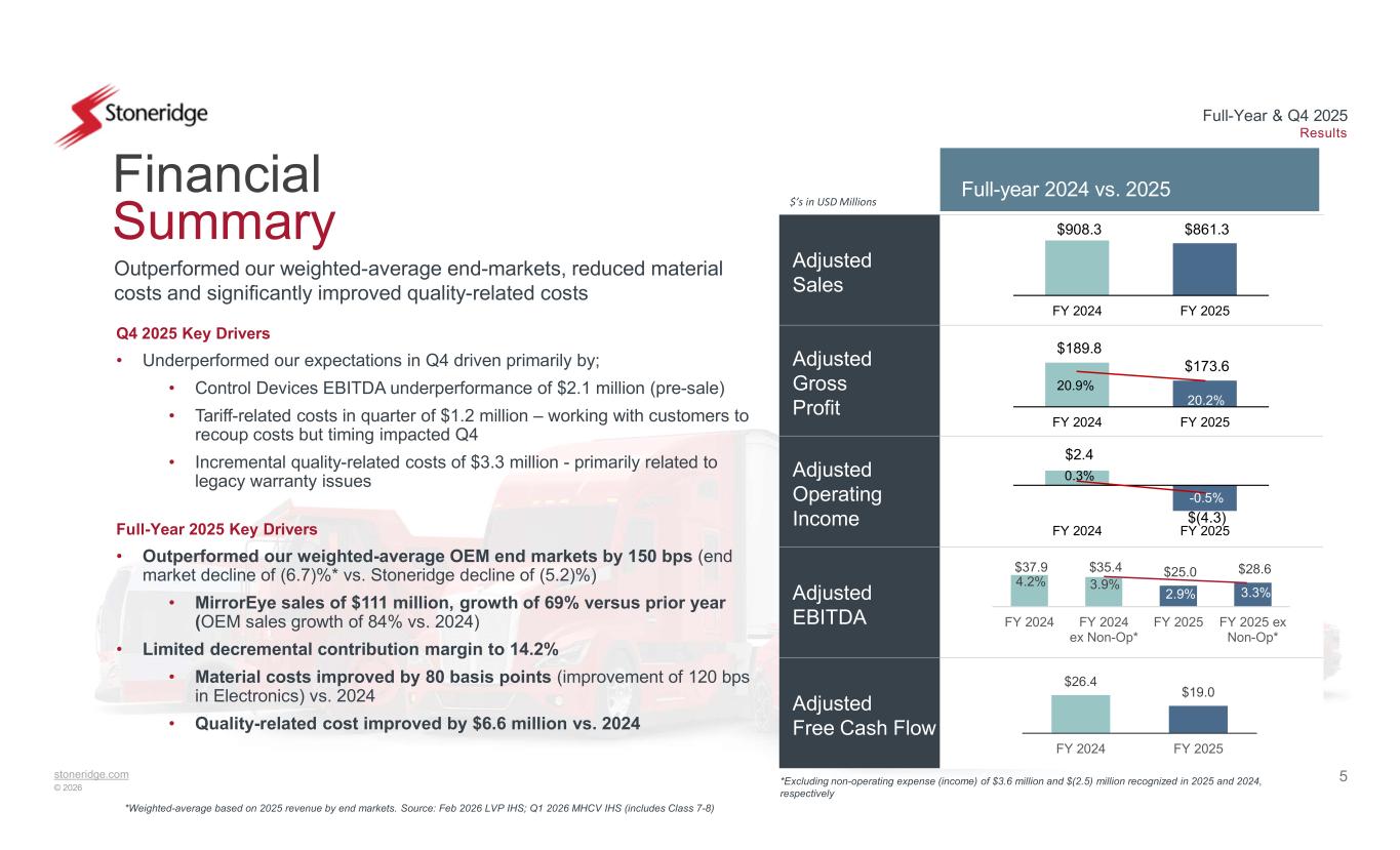 stoneridge.com © 2026 Full-Year & Q4 2025 Results • Outperformed weighted-average OEM end markets by 150 basis points* • MirrorEye revenue growth of 69% year-over-year driven by the continued ramp-up of previously launched programs and new program launches • OEM sales in Brazil ~doubled vs. 2024 • Announced new business awards in 2025 totaling ~$830 million in estimated lifetime revenue – including the largest award in Company history • Limited the impact of significant end-market headwinds by controlling material costs, reducing quality-related costs and driving continued inventory reductions • Material cost improvement of 80 basis points • Quality-related cost improvement of $6.6 million, or 50 bps • Inventory improved by $18.7 million, including $12.7 million in Q4 2025 • Completed the sale of the Control Devices segment on January 30, 2026 2025 Overview of Achievements Sales $861.3M 1.5% outperformance of end markets* Full Year 2025 Results 2.9% of YTD Sales $25.0M Inventory Improvement $18.7M 12.3% YoY Improvement Adjusted Free Cash Flow Adjusted EBITDA $19.0M *Weighted-average based on 2025 revenue by end markets. Production Data Source: Feb 2026 LVP IHS; Q1 2026 MHCV IHS (includes Class 7-8) 4