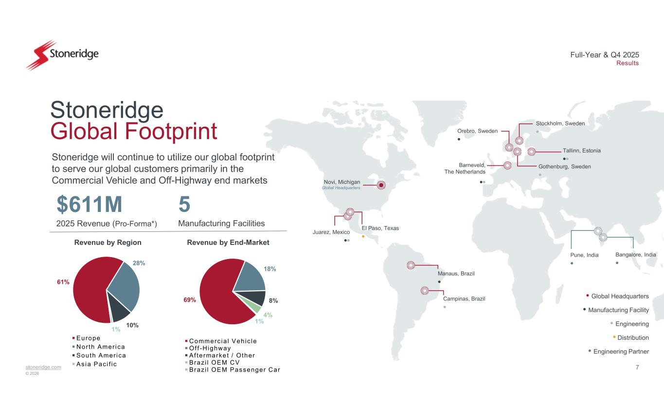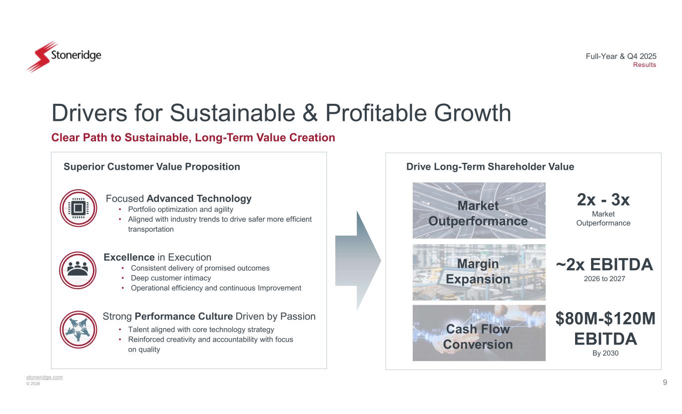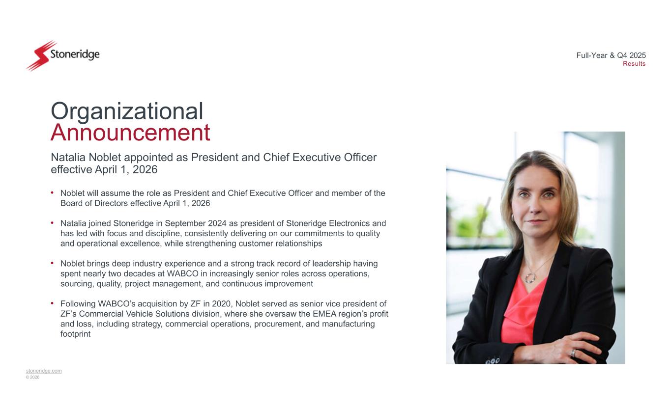 stoneridge.com © 2026 Full-Year & Q4 2025 Results Organizational Announcement • Noblet will assume the role as President and Chief Executive Officer and member of the Board of Directors effective April 1, 2026 • Natalia joined Stoneridge in September 2024 as president of Stoneridge Electronics and has led with focus and discipline, consistently delivering on our commitments to quality and operational excellence, while strengthening customer relationships • Noblet brings deep industry experience and a strong track record of leadership having spent nearly two decades at WABCO in increasingly senior roles across operations, sourcing, quality, project management, and continuous improvement • Following WABCO’s acquisition by ZF in 2020, Noblet served as senior vice president of ZF’s Commercial Vehicle Solutions division, where she oversaw the EMEA region’s profit and loss, including strategy, commercial operations, procurement, and manufacturing footprint Natalia Noblet appointed as President and Chief Executive Officer effective April 1, 2026