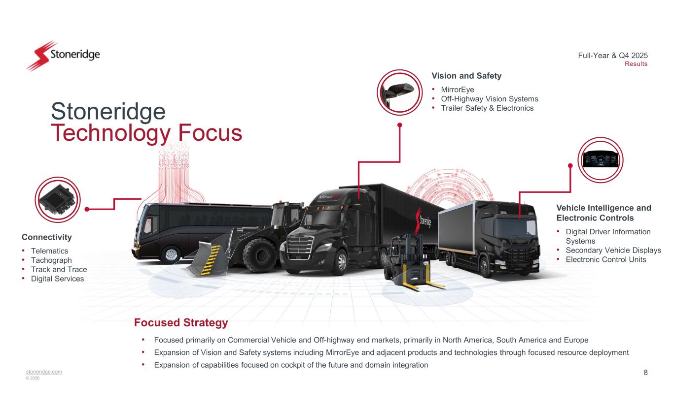 stoneridge.com © 2026 Full-Year & Q4 2025 Results 7 Stoneridge Global Footprint • Global Headquarters • Manufacturing Facility • Engineering • Distribution • Engineering Partner Stoneridge will continue to utilize our global footprint to serve our global customers primarily in the Commercial Vehicle and Off-Highway end markets Novi, Michigan Global Headquarters Juarez, Mexico •• El Paso, Texas • Manaus, Brazil • Campinas, Brazil • Barneveld, The Netherlands •• Gothenburg, Sweden • Tallinn, Estonia •• Orebro, Sweden • Stockholm, Sweden • Pune, India • $611M 2025 Revenue (Pro-Forma*) 61% 28% 10% 1% Europe North Amer i ca South Amer ica As ia Pac i f ic 69% 18% 8% 4% 1% Commerc ia l Vehic le Of f -Highway Af termarke t / Other Braz i l OEM CV Brazi l OEM Passenger Car Revenue by Region Revenue by End-Market Bangalore, India • 5 Manufacturing Facilities